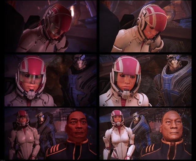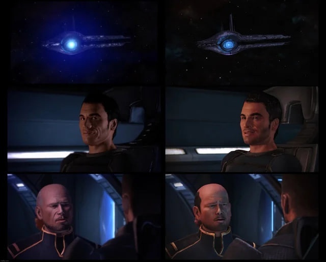 В оригинале , в особенности в Mass Effect 2, освещение делалось с учетом постановки сцен, чтобы картина смотрелась эстетично с повествовательной точки зрения. ME2 была мрачной игрой согласно видению оригинальной Bioware, в то время как в ремастере новые разработчики просто тупо прилепили все источники освещения на поплавок.