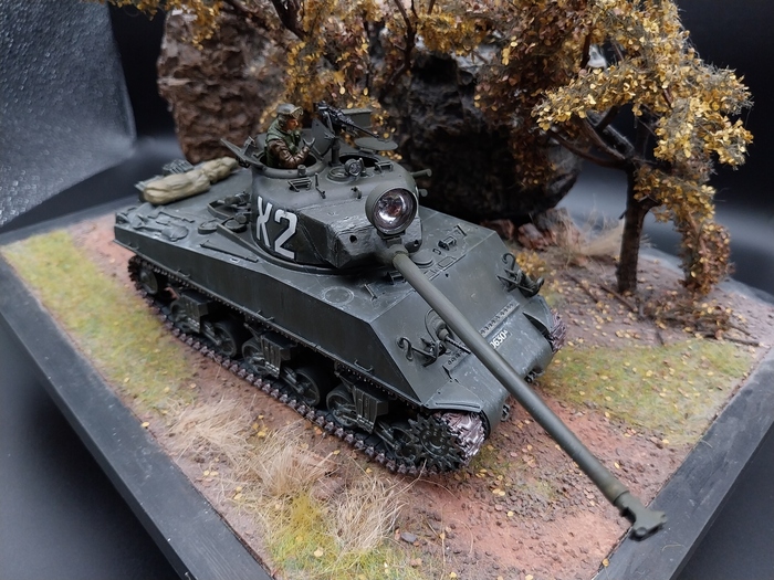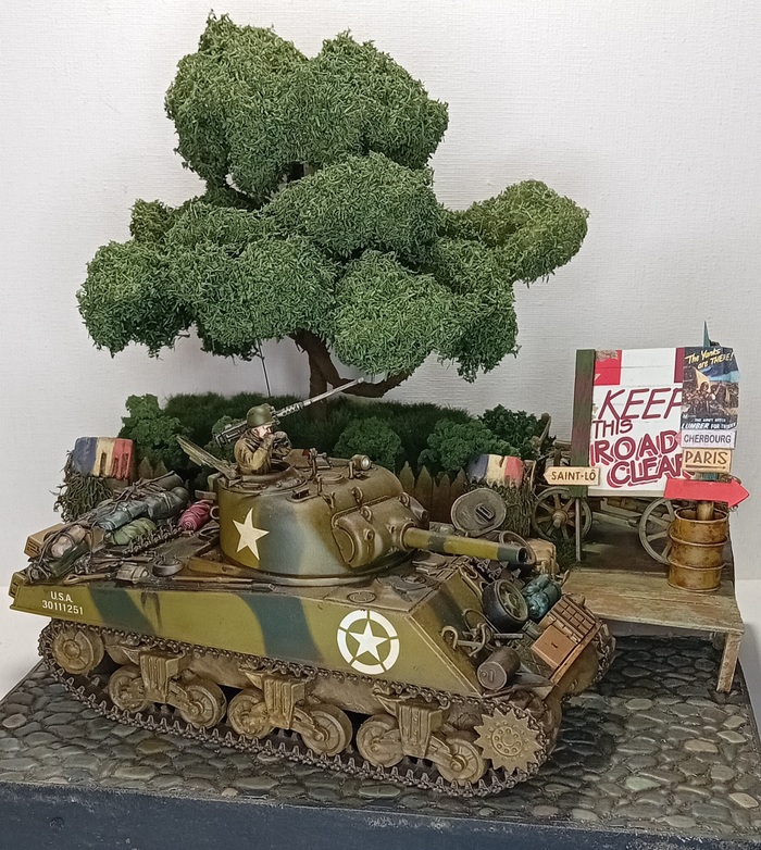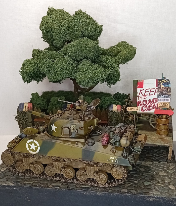 В своих работах я стараюсь чередовать стороны конфликта каждую новую диораму, поэтому после зарисовки, посвящённой теме советских разведчиков в Венгрии я решил в этом проекте затронуть тему союзников в Европе, конкретно американский контингент в Европе. В этой теме на мой взгляд никуда без Шермана, набитого разным хабаром и для работы я взял Шерман со 105 мм пушкой от Тамии, старый, но добротный набор, про его сборку в следующий раз, а сегодня немного о самой подставке.