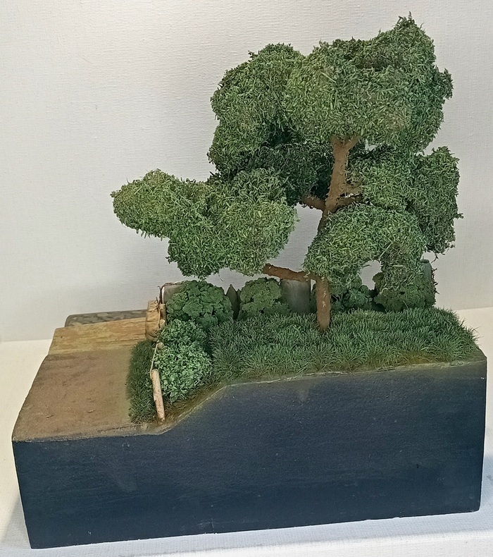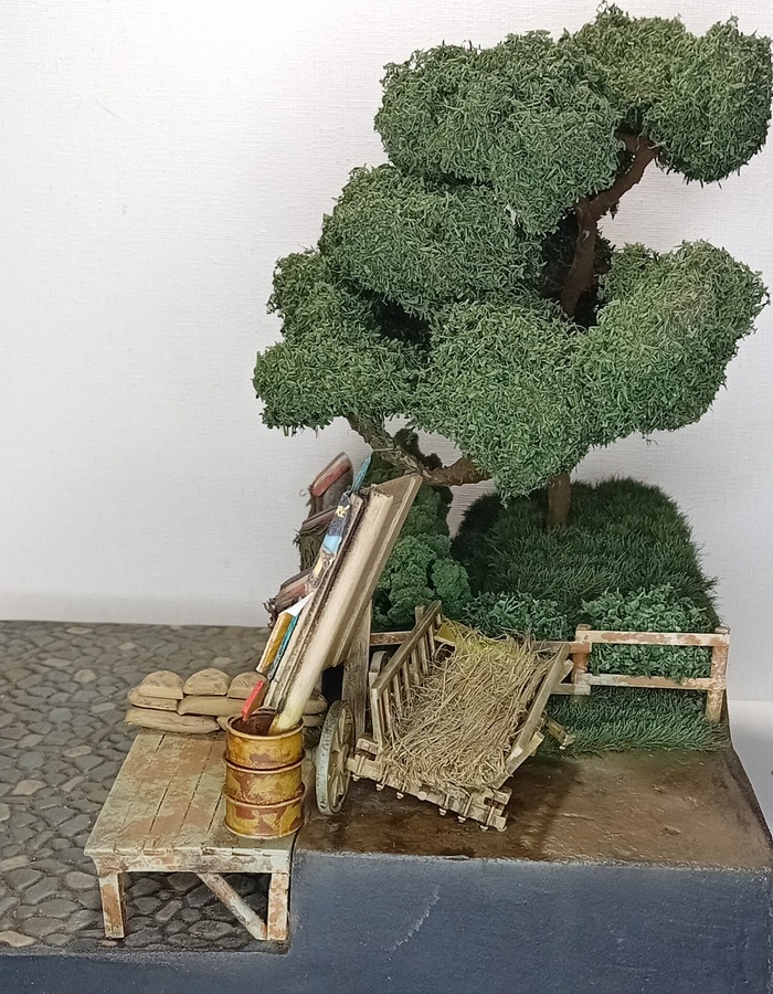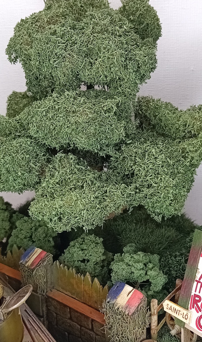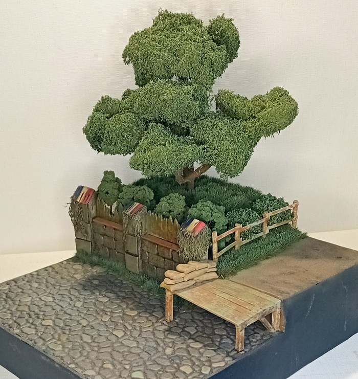 Сформировалась крона, осталось только добавить листья - я не поскупился и приобрёл за 700р целую баночку мелкой зелёной листвы, которую также закрепил на ветки и крону аэрозольнвм клеем. Дополнительно все окрасил из вэрографа в зелёный оттенок, общий для диорамы.