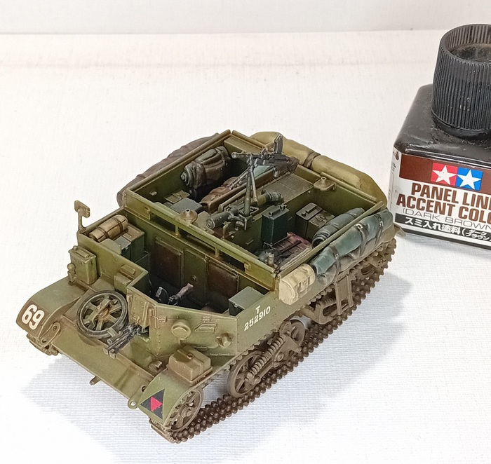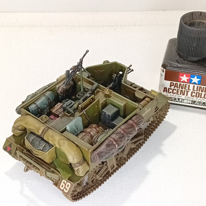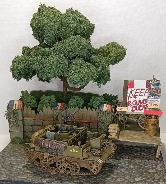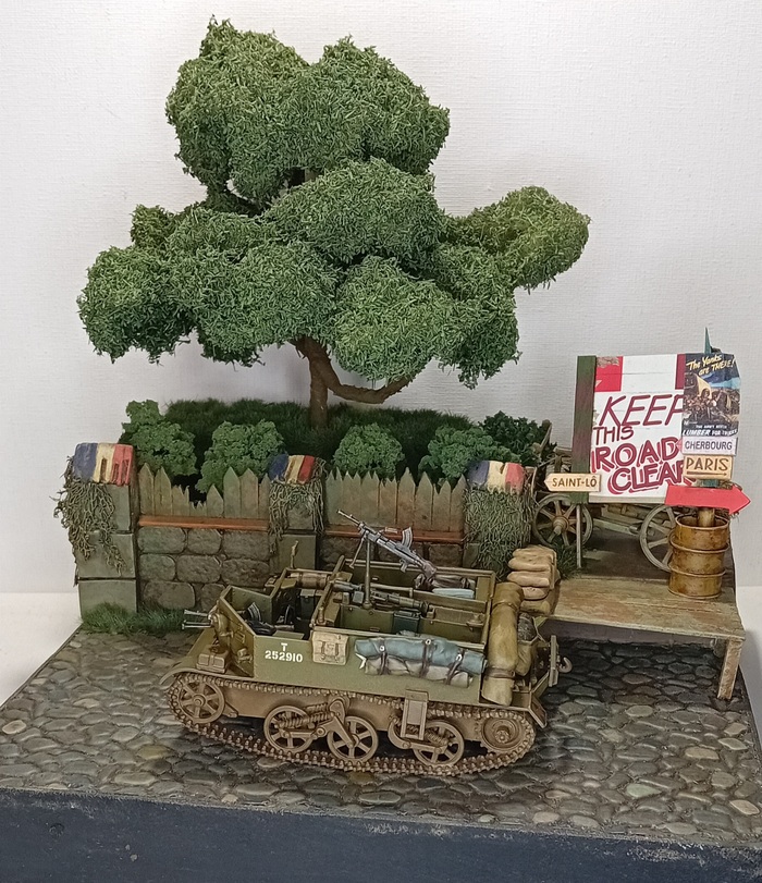 А так диорама выглядит с расположенной на ней техникой, в итоговом варианте не будет ни шермана, ни карриера (карриер собран и окрашен для параллельного британского проекта диорамы, который находится еще только на стадии сбора необходимого материала), но сегодня мне ничего не мешает показать эту технику в таком оформлении.