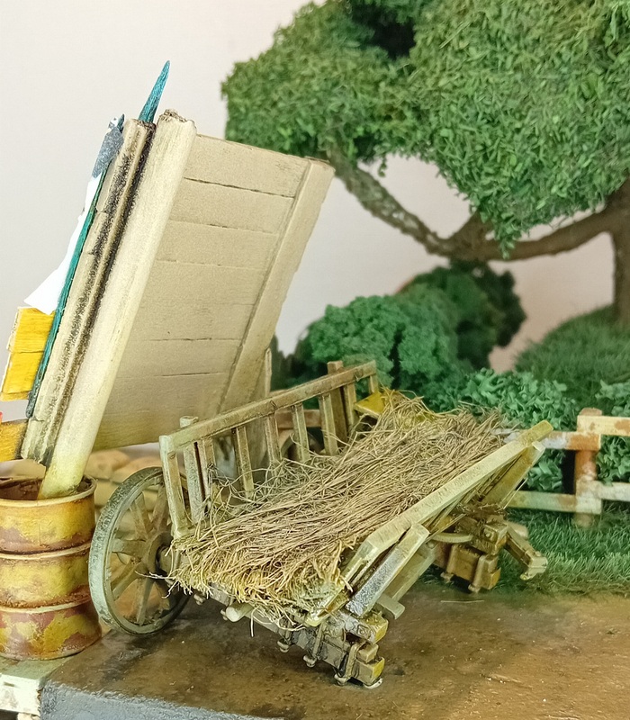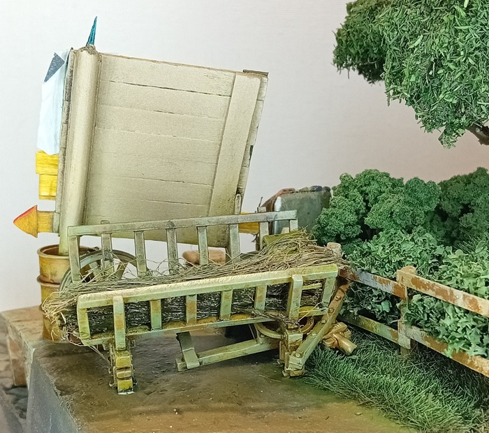 Для реализации идеи, мне с одной стороны нужно было замаскировать немцев вглубине диорамы, чтобы они не были видны с дороги, а с другой привязаться к теме конвоев red ball express. Чтобы убить двух зайцев сразу, я собрал из деревянных палочек стенд и по военному воткнул его с одной стороны в бочку, декалью разместил на нем предупреждение, что дороги для конвоев следует держать свободными, а позади стенда приспособил развалившуюся повозку с сеном от master box (при сборке её пришлось укорачивать на 2,5-3 см, что было тем ещё квестом). Стенд и повозка создали на мой взгляд идеальную "баррикаду" между булыжной мостовой и перпендикулярной сельской дорогой. Таким образом и диорама получила новых ярких визуальных объектов и немцы будут надёжно "спрятаны".