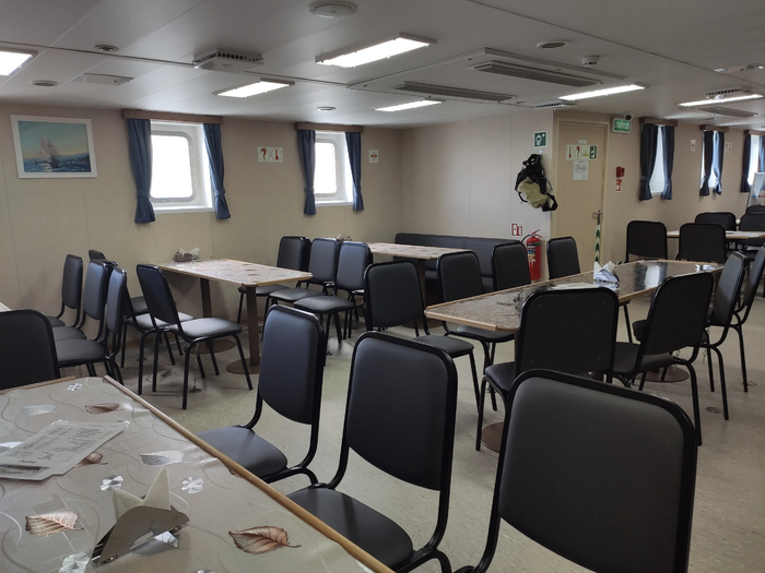 На теплоходе есть кафе, гордо названное рестораном. Оформлено все в духе полного минимализма, т.е. никак.