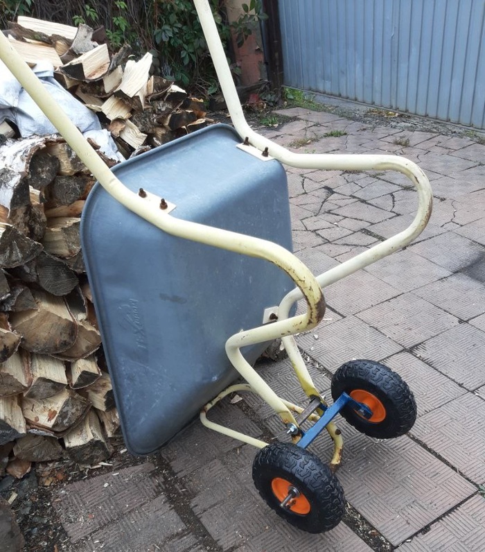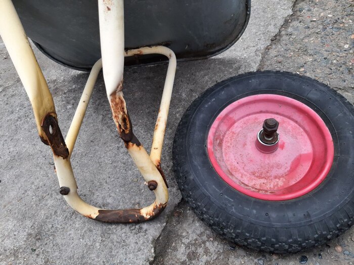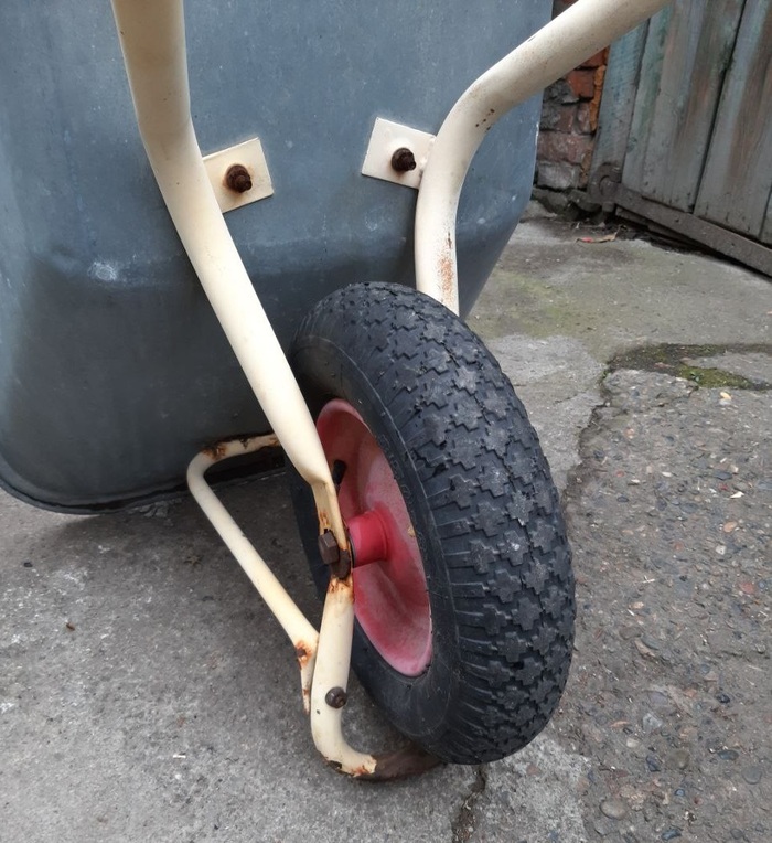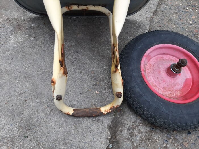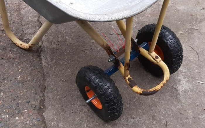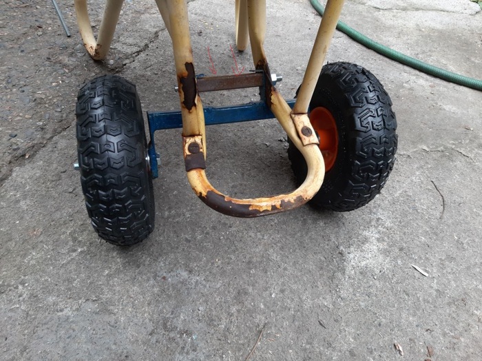 Чтобы высота тачки не изменилась, Нужно ось новых колес немного опустить. Берем из остатков всякого металла подходящие огрызки, немного замеров, отрезов и сварки трясущимися руками от которой в итоге получил загар-ожег одной руки и немного груди получаем вот эту конструкцию (уже покрытую грунт-эмалью по ржавчине):