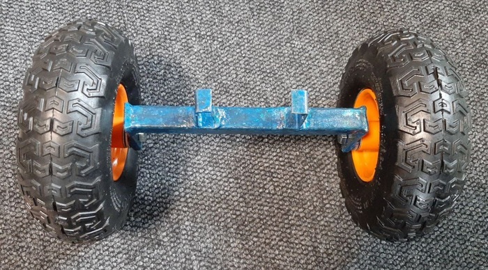 С крепежом получилась катавасия, что-то взбрело мне в голову, что 75 мм длины болта будет достаточно. Купил 2 болта 12х75, шайбы, гровера и гайки. Приехал домой и вот хера с два, не хватило длины болта. После обеда опять в маркет, купил еще длинную шпильку на 12, и 2 болта 12х120 (психанул, чтобы точно хватило) и опять что-то мне в голову вступило и вместо 12 мм гаек я прихватил 10мм (дааа, старость не радость). Ну да ладно, собрал колесики со стойкой:
