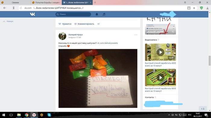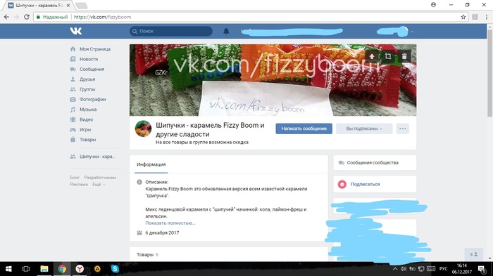 Искал я одним прекрасным днём в интернете, где бы можно купить конфеты, которые я часто ел в детстве и которые с недавних пор запретили в России. Называются "Шипучка". Порыскав по интернету, начал осознавать, что так и не смогу найти нужные мне сласти. Но вот однажды, перелопатив уже кучу сайтов, подумал-ка я зайти в вк. Вбив в поиске групп название конфет, мне первой же высветилась группа "Шипучки [Россия]" (группа работает до сих пор). Так вот, я, окрылённый, нажал на группу и там всё было прекрасно.