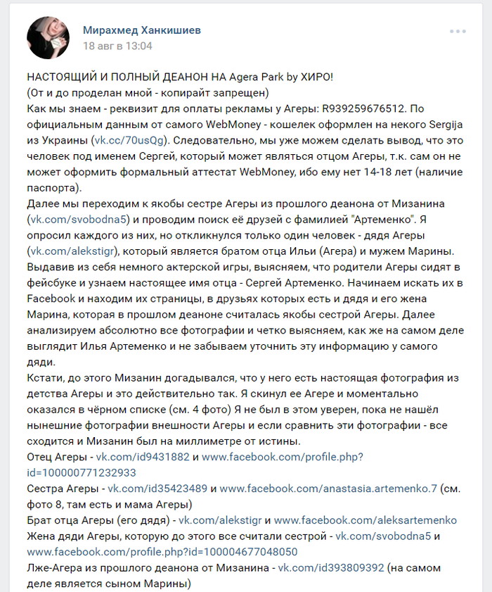 Каково же было моё удивление, когда спустя год с лишним я увидел, что группа всё ещё работает. Зайдя на страницу Мирахмеда, я увидел пост, который доказал что страница Maria Brown - это его фейк. В этом посту он разоблачал какого-то блогера, используя для этого страницу Maria Brown (прикладываю скрин поста)