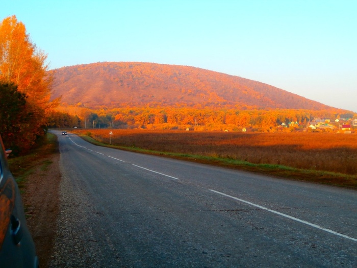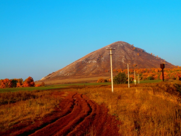 После очередного поворота дорога вывела нас на открытое пространство и, наконец, мы увидели цель нашего путешествия - гору Юрактау. Последние километры до шихана мы преодолевали по грунтовой дороге, обрамленной пожелтевшей травой.