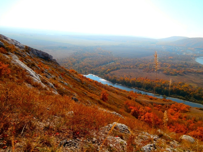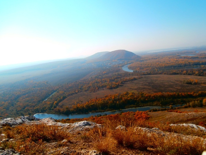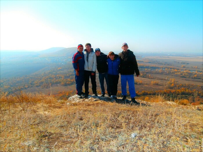 Не было еще и десяти часов, когда мы «покорили» нашу первую вершину. Следующие сорок минут провели сидя на траве и камнях, молча созерцая красоту окружающего мира. Единственным нарушителем тишины был теплый ветер, доносивший до нас запах трав и цветов в изобилии растущих среди камней на вершине. Вдалеке виднелись заводы Стерлитамака.