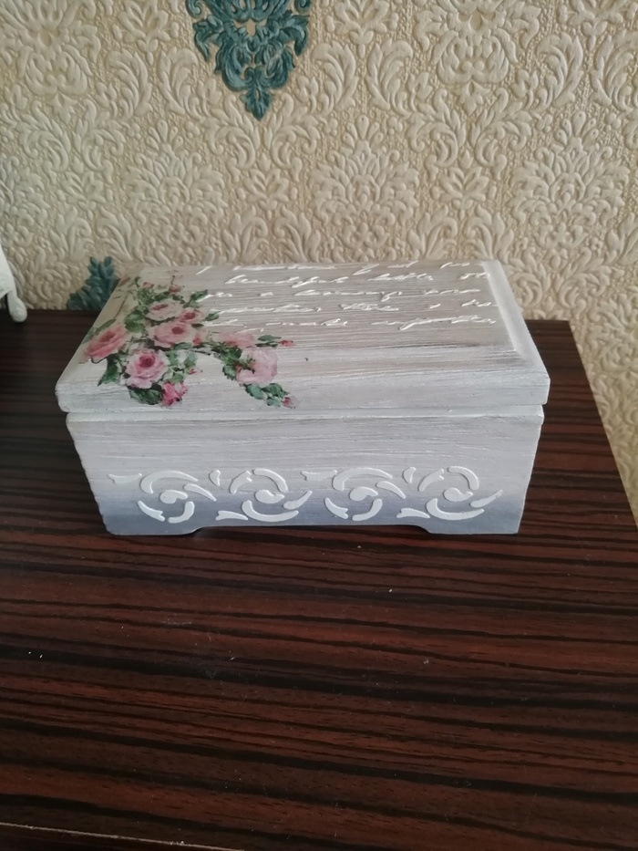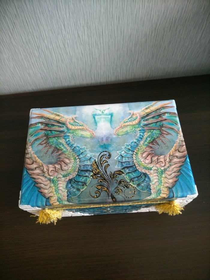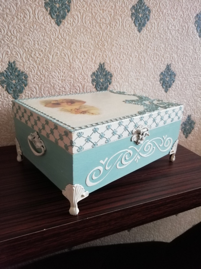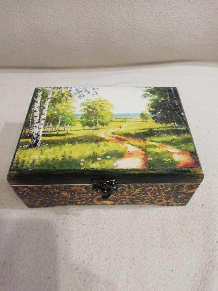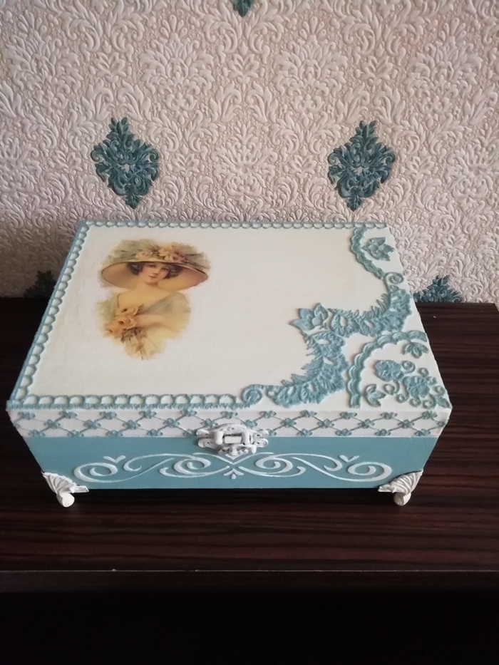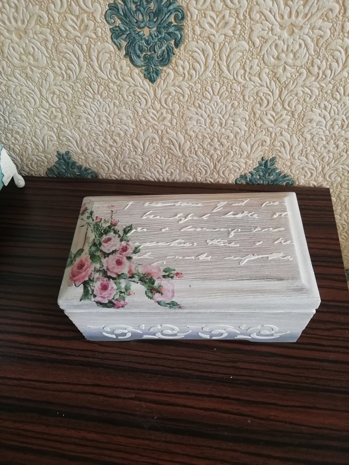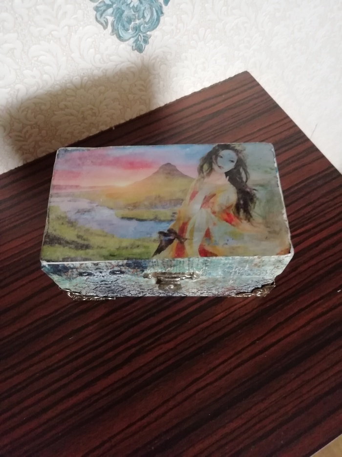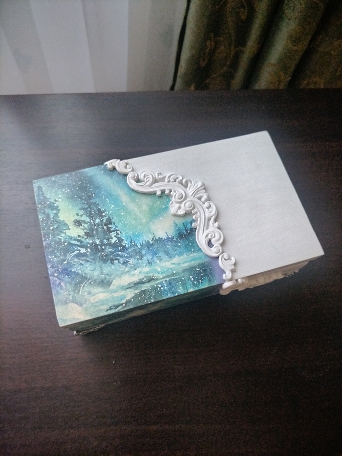 Свои работы начинала с техники декупаж. И, естественно, шкатулки - первое, что приходит на ум сделать и любимый вид работы. Эта из последних. Она послужил "упаковкой" к основному подарку знакомой женщине на юбилей. Для рождённой в конце декабря прям в тему пошла)
