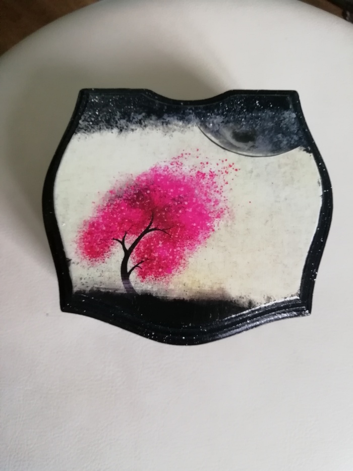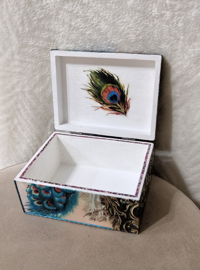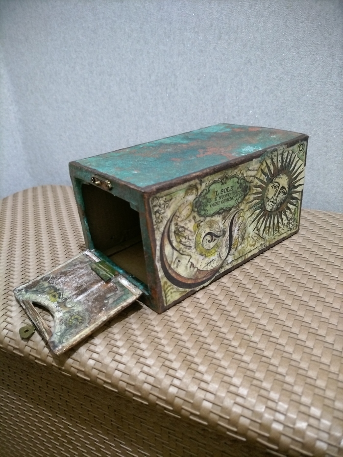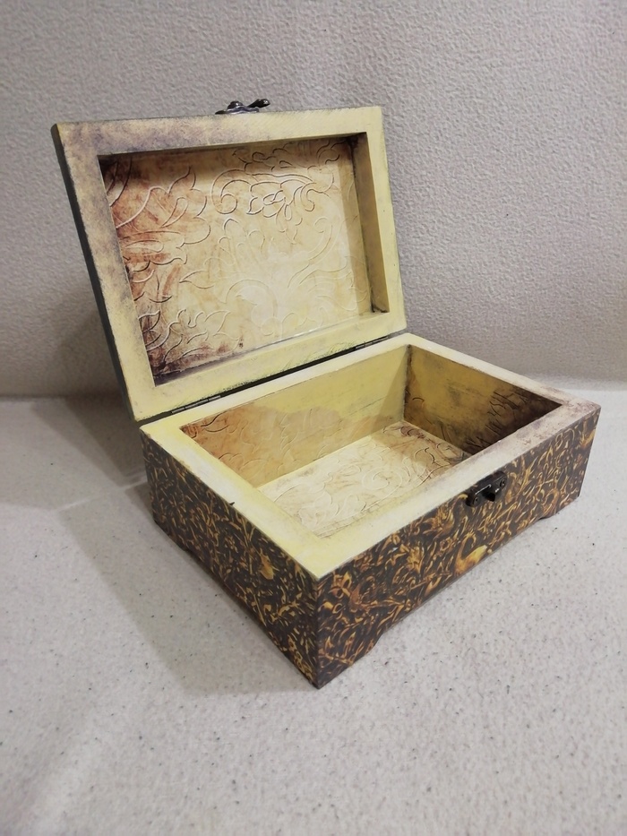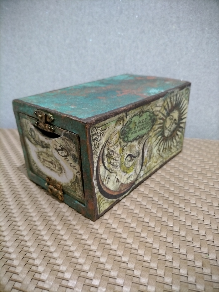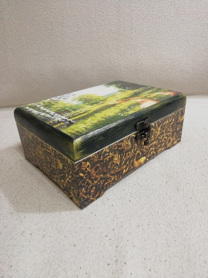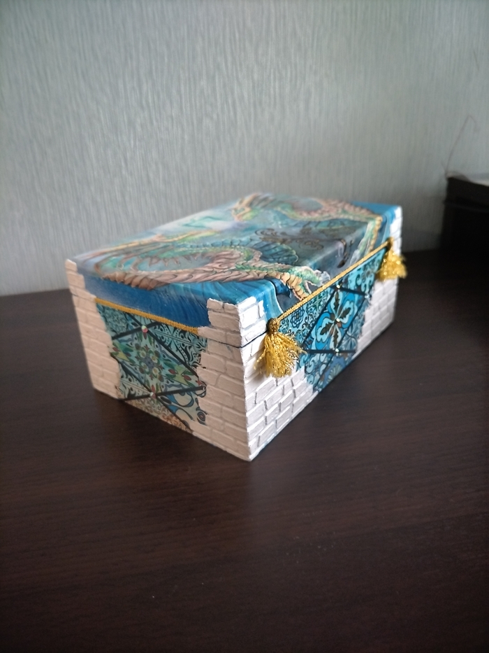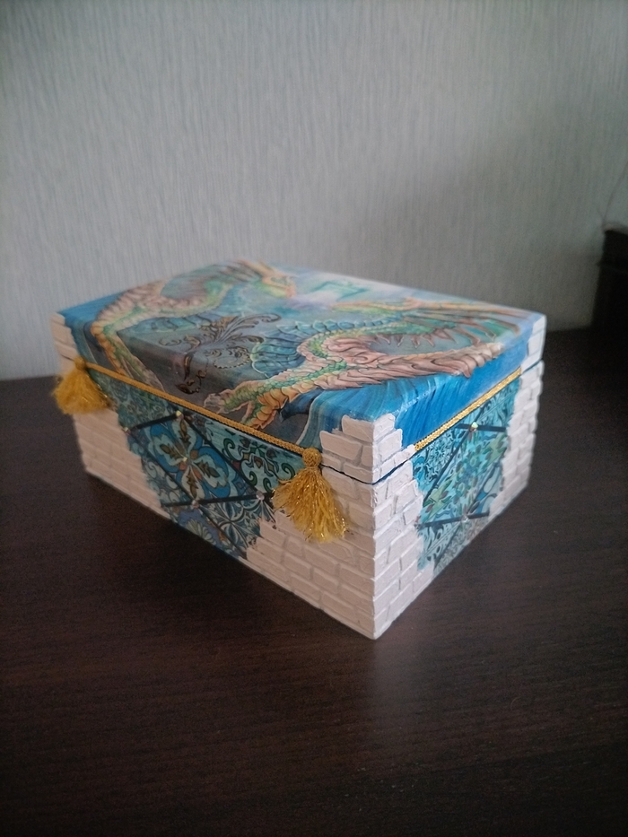 Свои работы начинала с техники декупаж. И, естественно, шкатулки - первое, что приходит на ум сделать и любимый вид работы. Эта из последних. Она послужил "упаковкой" к основному подарку знакомой женщине на юбилей. Для рождённой в конце декабря прям в тему пошла)