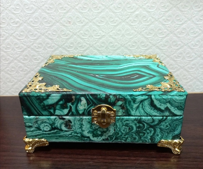 А следующая - особенная) эту шкатулку пришлось не делать, а переделывать. У дочки была удобная и нужная, но не красивая, шаблонная, с декором под "А-ля прованс". Попросила сделать что-нибудь лучше. На вопрос "какую хочешь? ", пошутила " малахитовую". Ну, ок, не проблема))