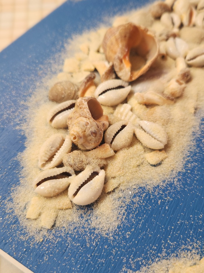 Самым простым было красить, это дело я люблю, только дайте кисть и краску. Далее на герметик посадила ракушки и осколки ракушек. Пришлось использовать много герметика, так как держались они не очень, сам герметик после посыпала песком, посчитала хорошим вариантом для морской тематики + так не было видно сам герметик.
