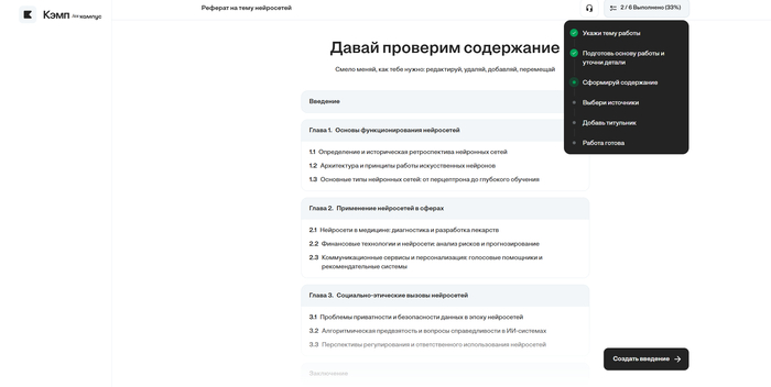Таким образом, если ваша задача — подготовить серьёзную текстовую работу, Кэмп становится помощником, который не просто выдаёт текст, а обеспечивает оформление и релевантность темы под вузовские требования.