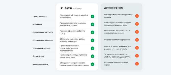 Кэмп — это мощная нейросеть для учебы, созданная специально под реальные студенческие задачи. Она понимает академические требования, оформляет тексты по ГОСТу, разбирает формулы и помогает создавать презентации по стандартам вузов. Кэмп работает как умный наставник: объясняет, структурирует и оформляет результаты без воды и ошибок. Здесь всё сделано так, чтобы студент мог сосредоточиться на содержании, а не на рутине форматирования и поиска источников.