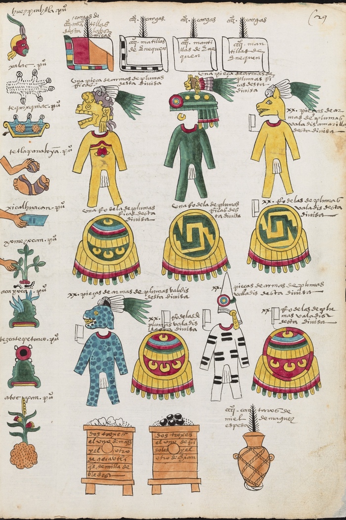 Да и в Кодексе Мендоса (рис. 2) можно найти аналогичные «костюмчики» — их ежегодно в Теночтитлан в качестве дани отправляли из подконтрольных территорий. А испанский епископ Диего де Ланда, автор «Сообщения о делах в Юкатане», пусть и про майя, но сообщает, что те носили шкуры ягуаров: