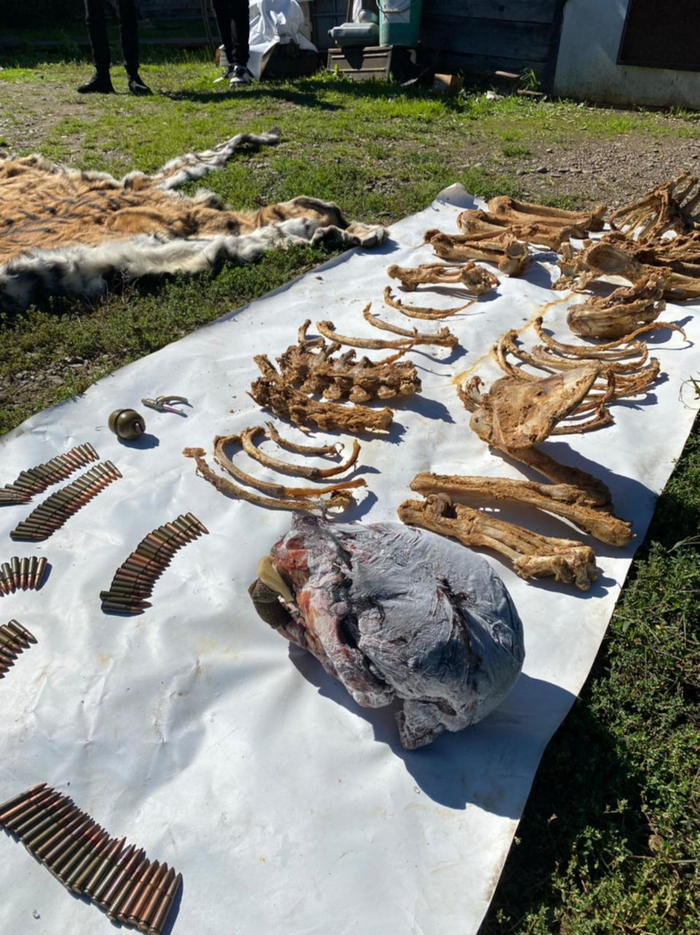 Шкура и кости тигра, а также граната и патроны калибра 7,62 были обнаружены и изъяты на территории частного дома в селе Верхний Перевал Пожарского района в результате мероприятий, проведённых сотрудниками Пограничного управления ФСБ России по Приморскому краю, о которых сообщалось в октябре 2022 года.