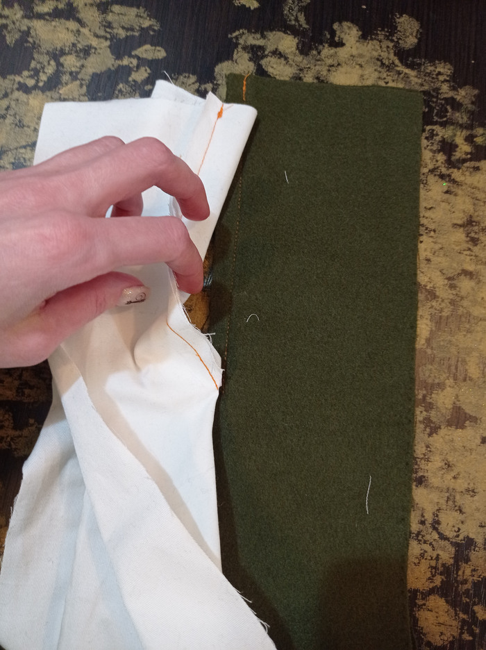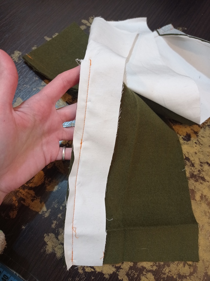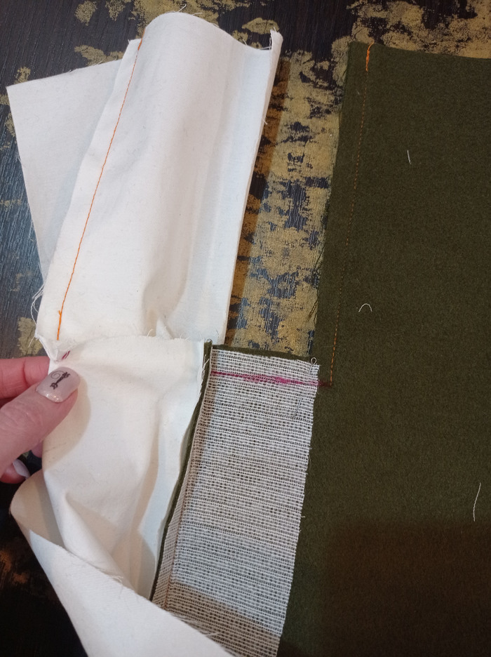 Соединяем лицо и подклад верхней части по вертикальному шву, отгибая эту надсечку.