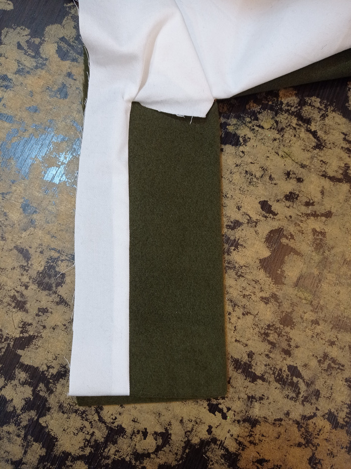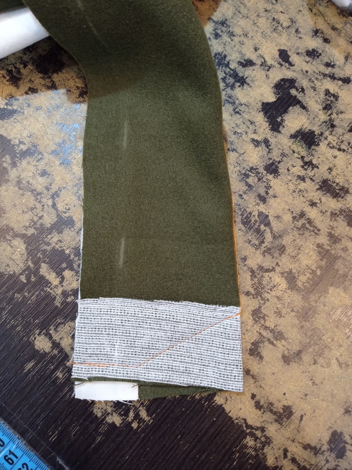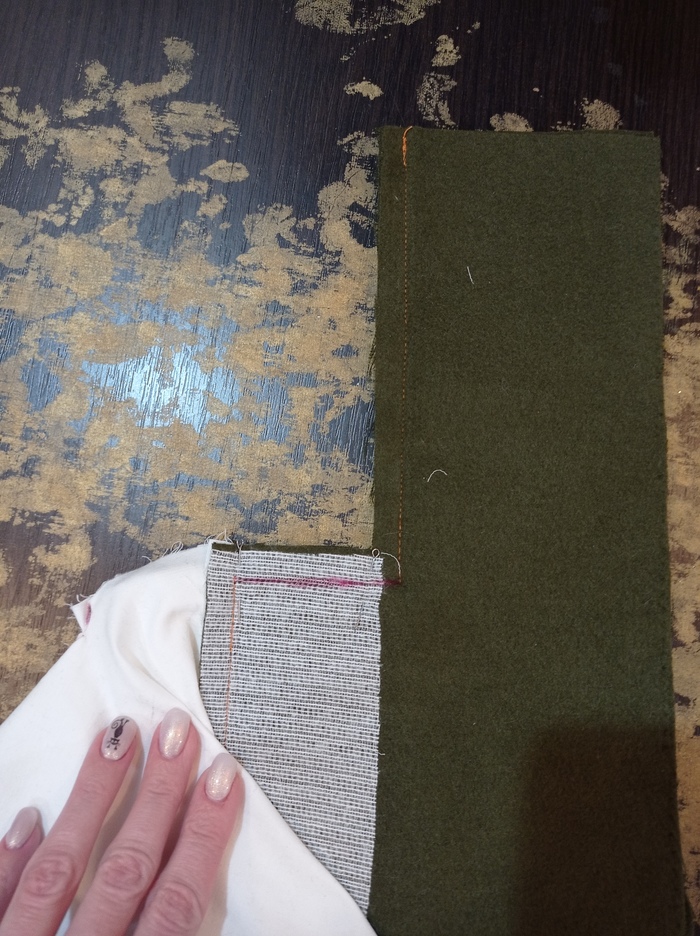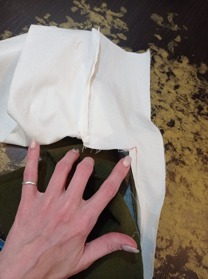 Соединям нижнюю часть шлицы по вертикальному срезу. Здесь есть хитрость. Верхний угол совмещаем, нижний край подгибаем на изнанку с подкладом внутри. На втором фото видно, что сгиб подклада чуть меньше сгиба лицевой детали. Такой напуск делается в принципе в верхней одежде для того, чтобы подклад не тянул лицо.