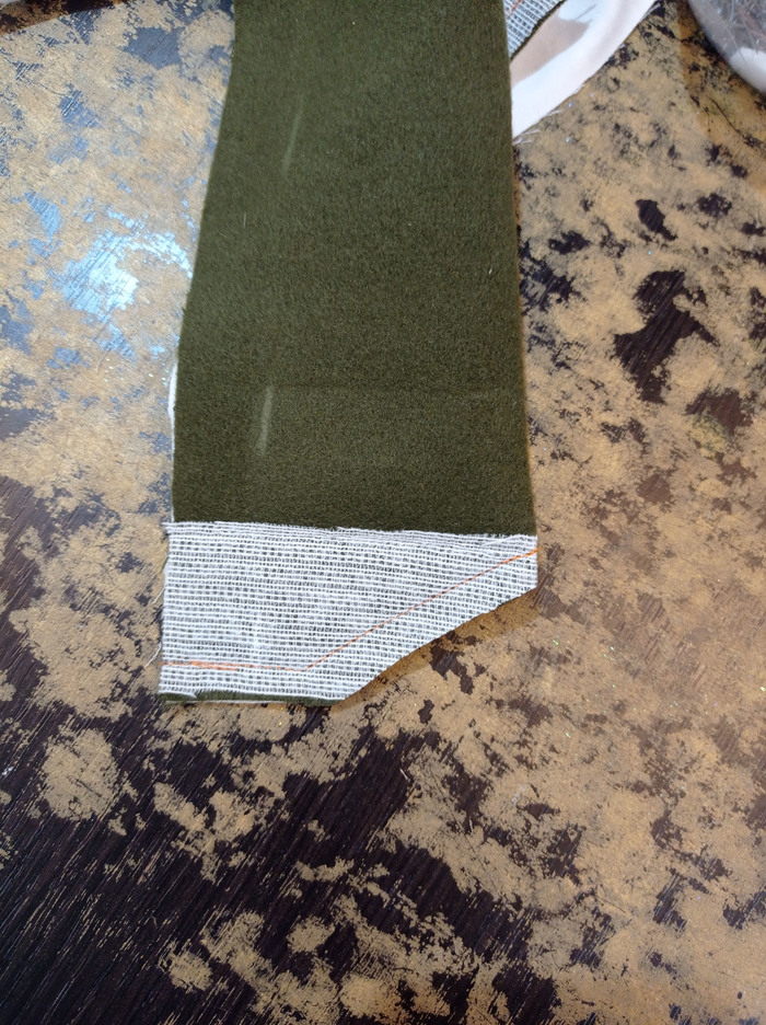 Теперь нам нужно соединить подклад и лицо по горизонтальному верхнему срезу шлицы. Для этого на внутреннем угле нужно сделать надсечку, не доходя до шва буквально 0,5-1 мм. (по красной линии)