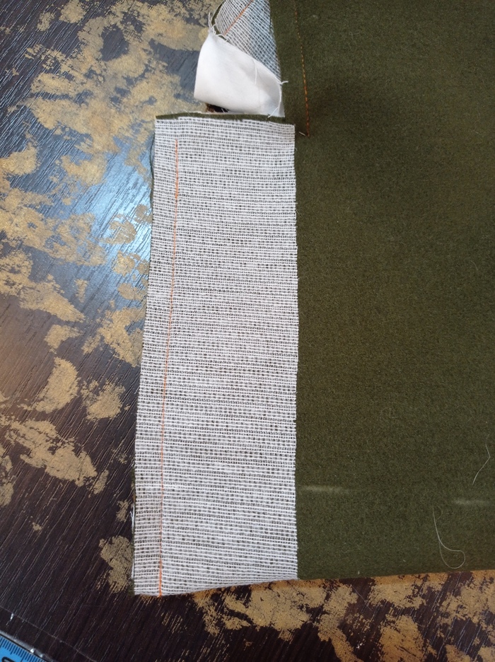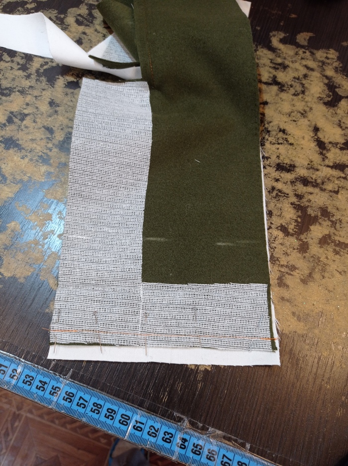 Здесь желательно сделать отстрочку. Отворачиваем подклад, намечаем отделочную строчку и прокладываем через три слоя лицевой ткани! Три раза туда-сюда.