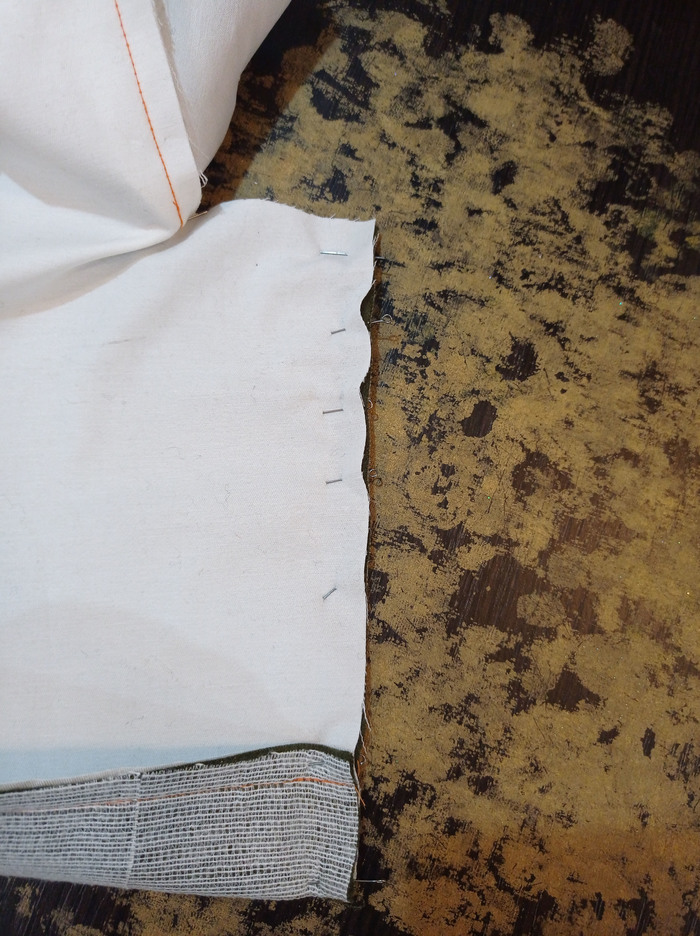 Далее скалываем булавками верхний горизонтальный срез шлицы - только лицевые детали!