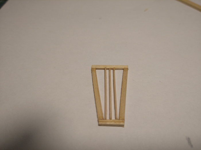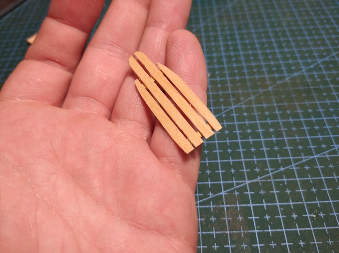 тут все тоже довольно просто, 4 полоски шпона, скрепляем двумя поперечинами и делаем в них прорези чтобы стали на киль. Вот это все в сборе: