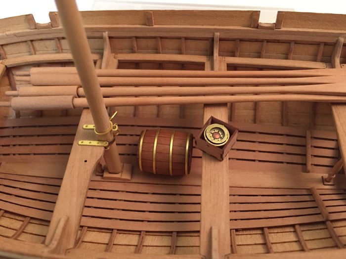 Работы по корпусу еще не окончены, чтоб закрепить мачту нужны путенсы, да и снастей нужны кофель-нагели. Да и в конце концов обратите внимание на славный фигурный степс! :)