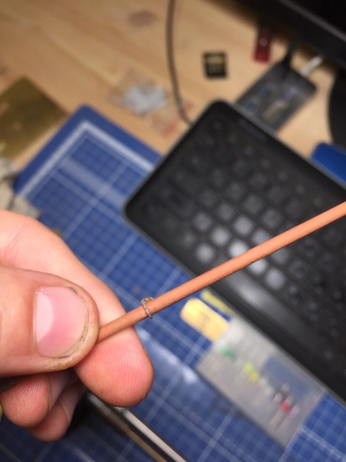В качестве разнообразия работ занялся мачтой. Бугель на ее топе согнут из полосы, а стык пропаян для надежности. Шкив кстати крутится, что логично для 24 масштаба.