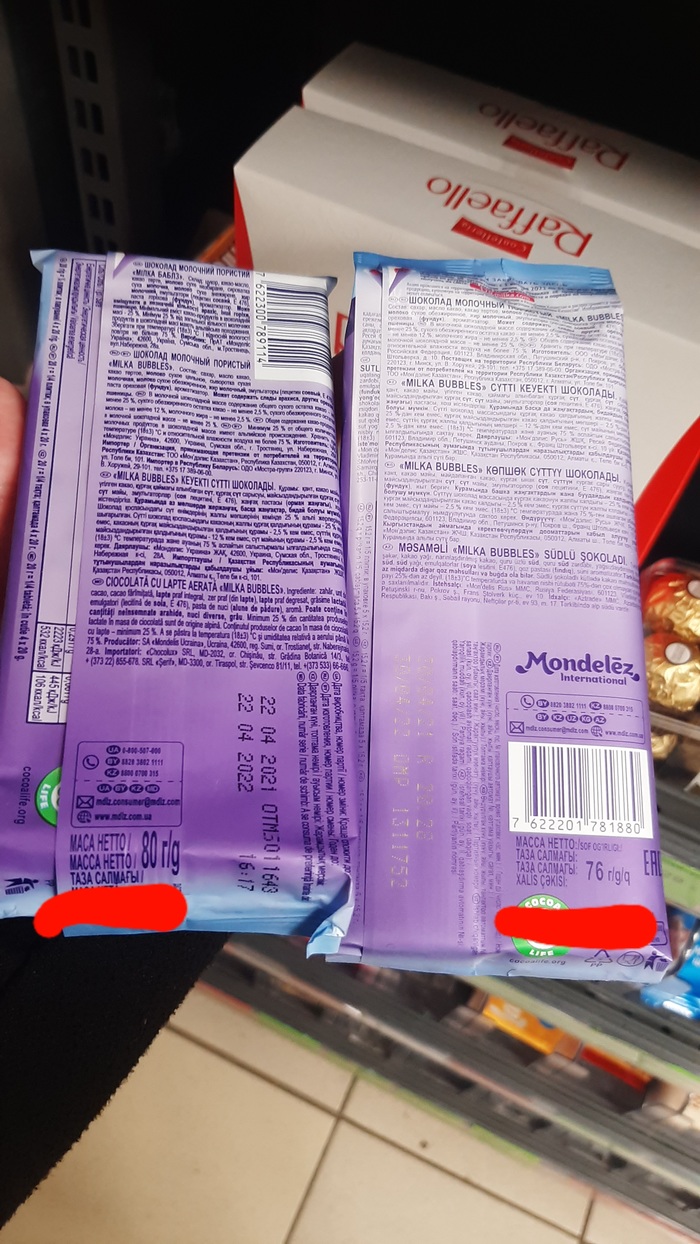Слева пористые шоколадки Милка весом 80 грамм по цене 2,49 BYN (старый завоз, зеленый ценник, без акции), а справа — пористые шоколадки Милка нового завоза, уже 76 грамм по 1,99 BYN (акционный красный ценник). Любопытно, сколько они будут стоить по истечении акции?