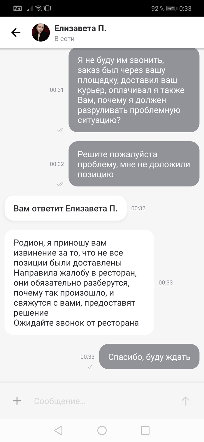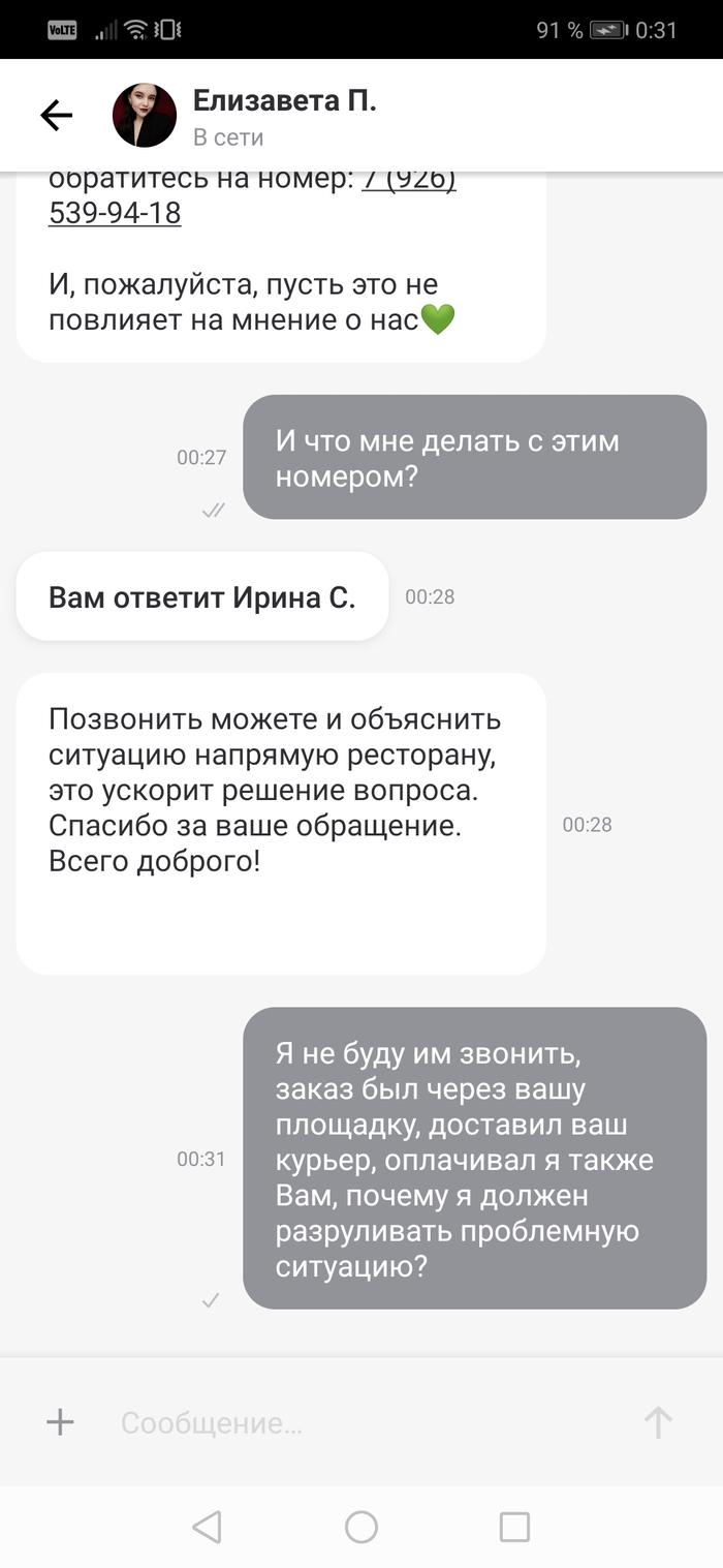Как видите ситуация такова: заказ через деливери, оплатил им же, доставка от них же. Но если проебали заказ, то ебись с ним и с рестораном сам!