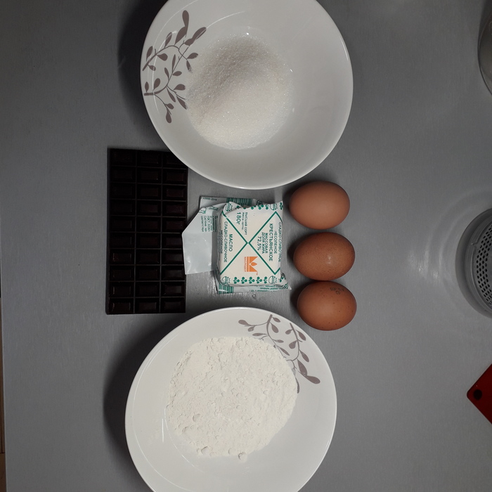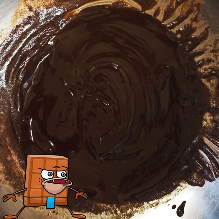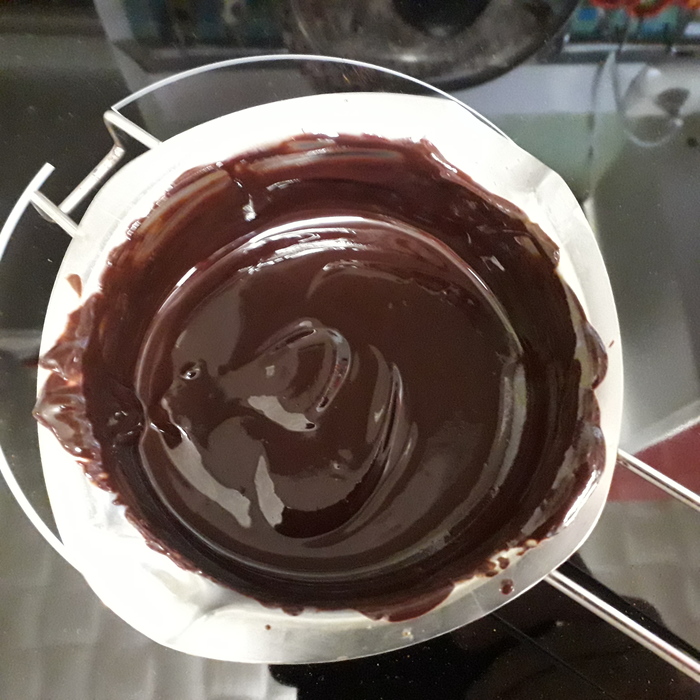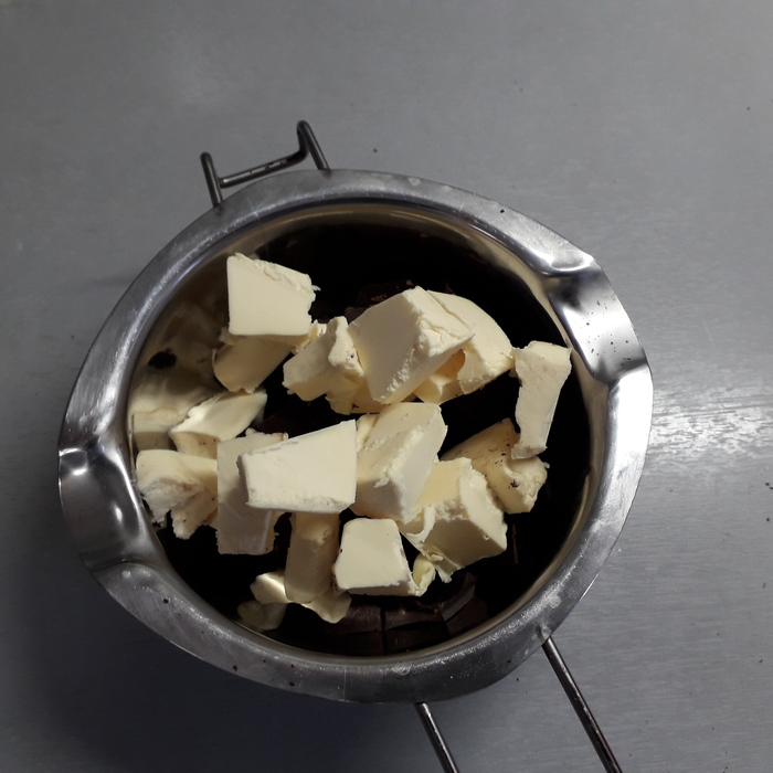 – В миске на водяной бане растопите шоколад вместе с маслом до полностью однородного, гладкого состояния. Снимите с огня и чуть остудите.Яичная смесь: