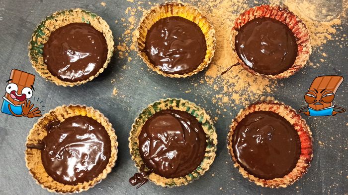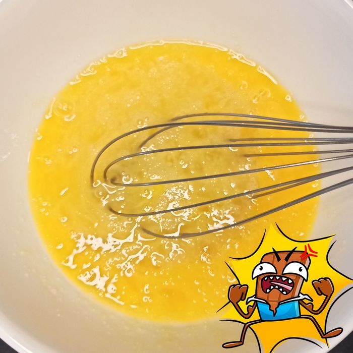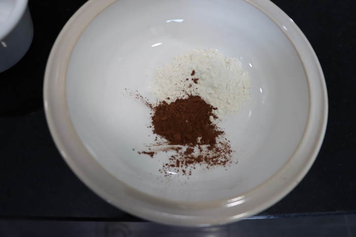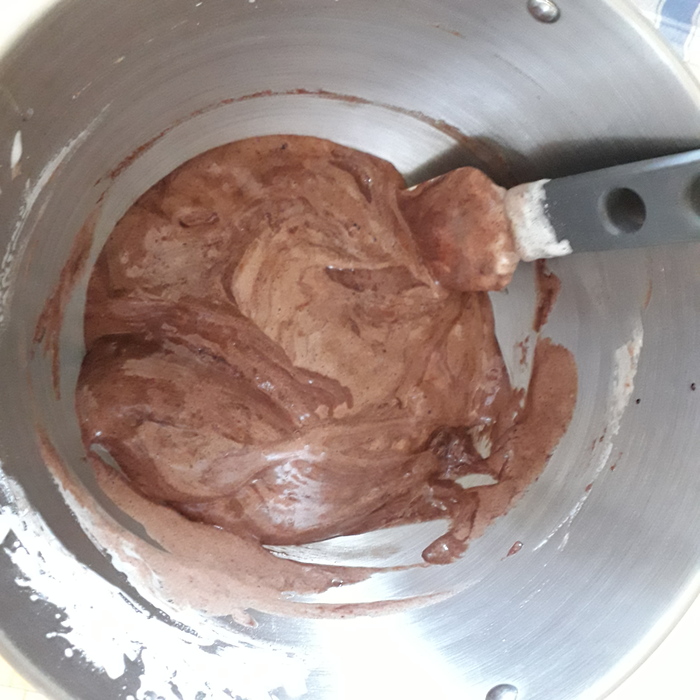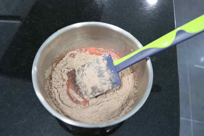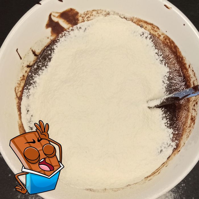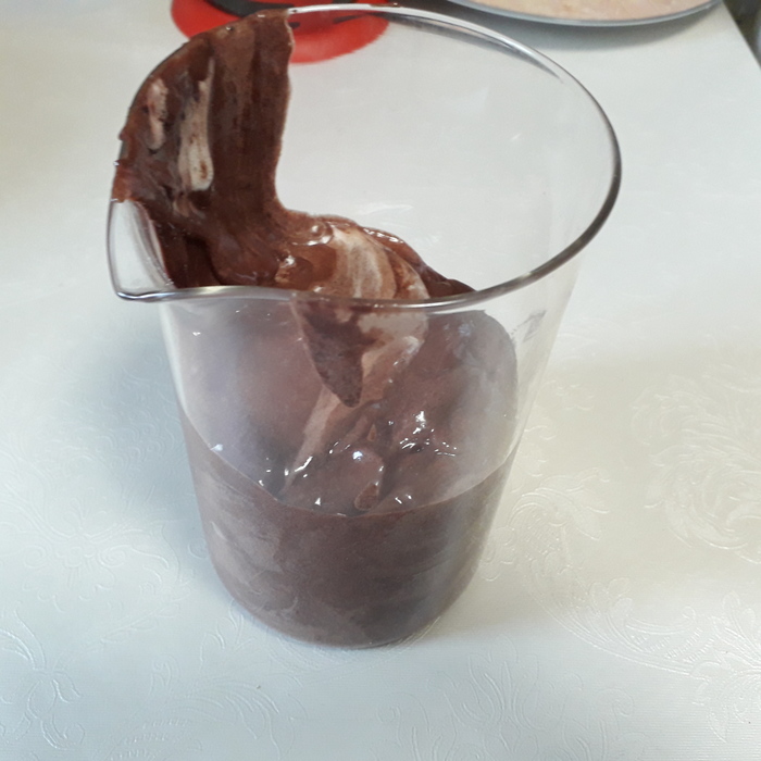 – Влейте тёплый шоколад в яичную массу тонкой струйкой, одновременно мягко перемешивая до однородности.Выпечка: