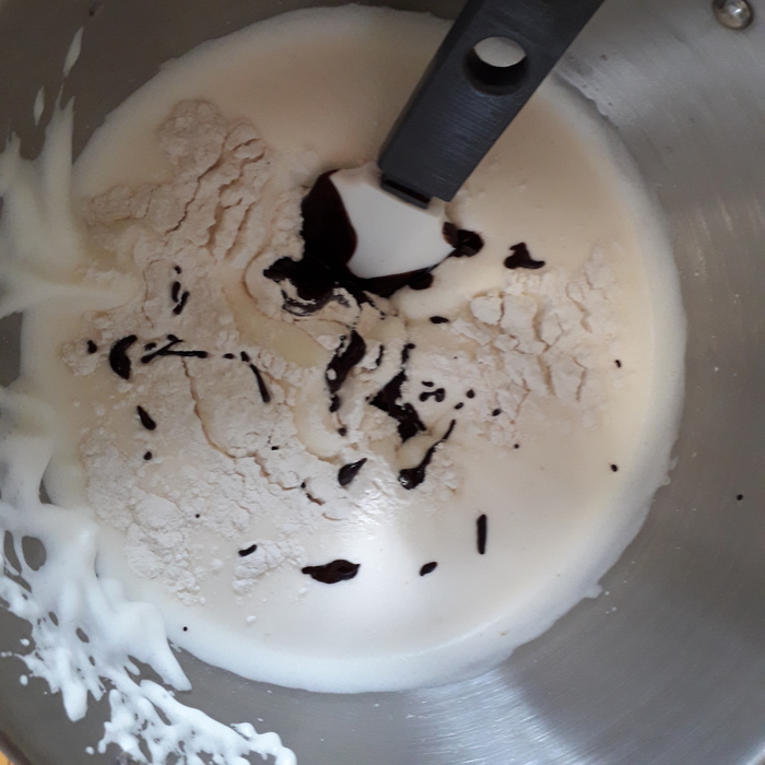 – Введите просеянную муку и рубленую мяту (или мятный экстракт), аккуратно перемешайте лопаткой.Соединение:
