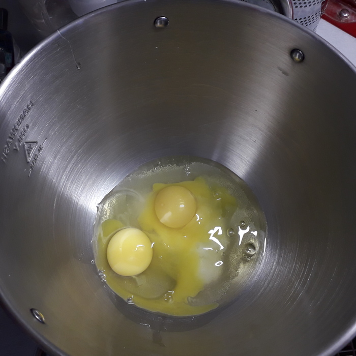 – В отдельной миске взбейте яйца, сахар и щепотку соли миксером или венчиком до светлой, пышной пены (2–3 мин).