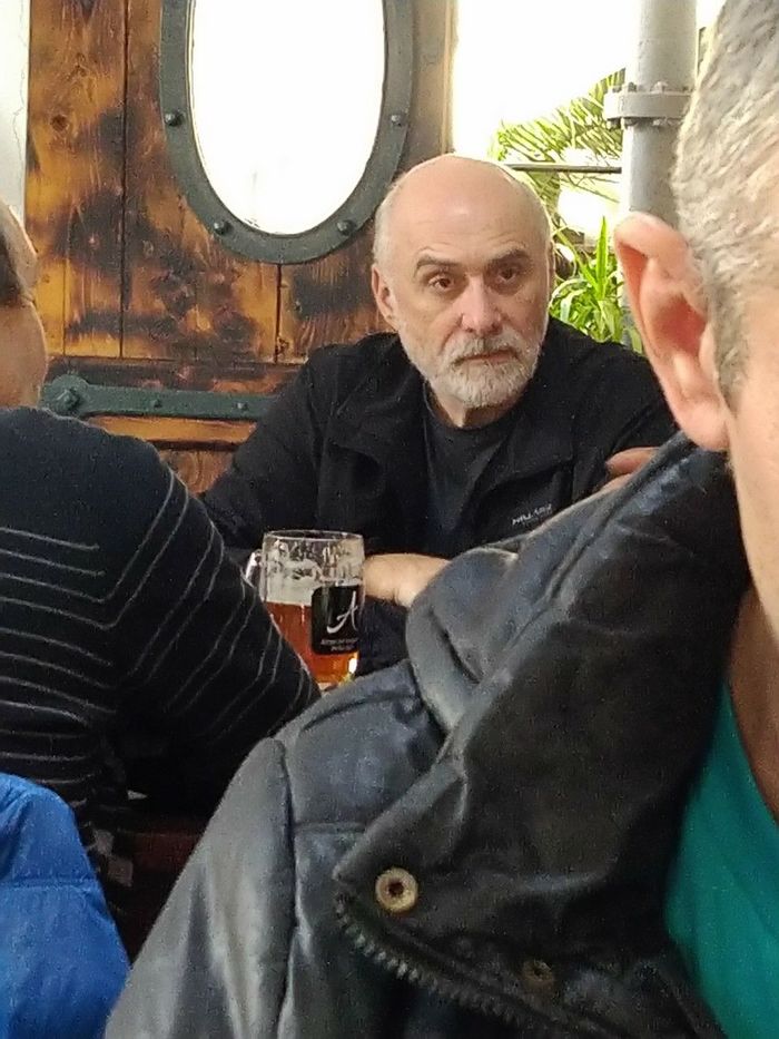 Внизу находится местная пивоварня. Решив отведать местного пива, увидел за соседним столиком этого товарища)