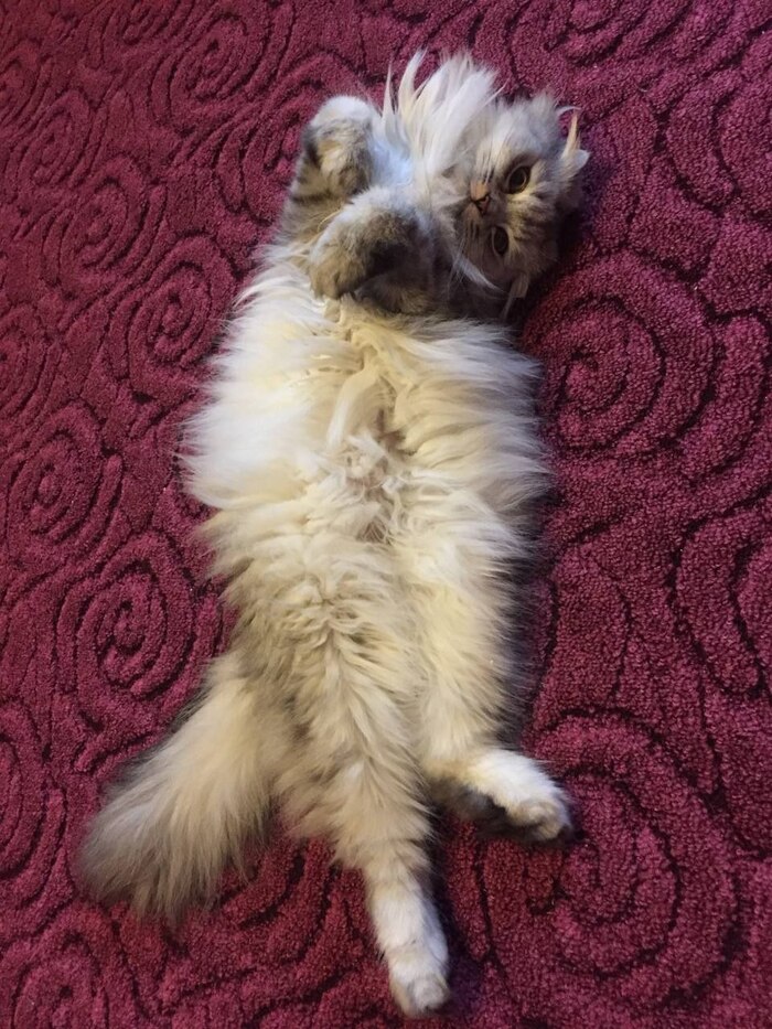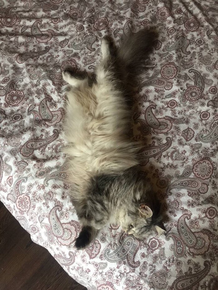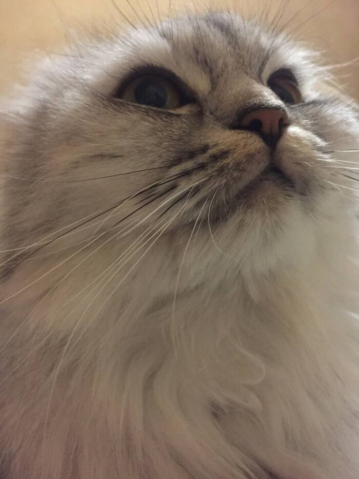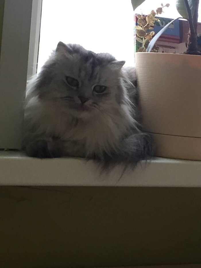 Стеша, светлая длинная шерсть, маленькие ушки, ласковая, менее контактная, чем Муся, очень спокойная, опрятная, гладиться приходит сама. Ей нужны тишина и покой, без них она стрессует. Любит спать, не любит, когда ей трогают задние лапки и хвост.