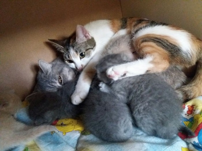 На прошлую пасху кошка родила котят. Ну как родила...кесарево сделали. Пока новоиспеченная мать приходила в себя младшая кошка взяла бразды материнства в свои лапки. Она грела котят а мы их кормили, всех выкормили и вырастили здоровыми.