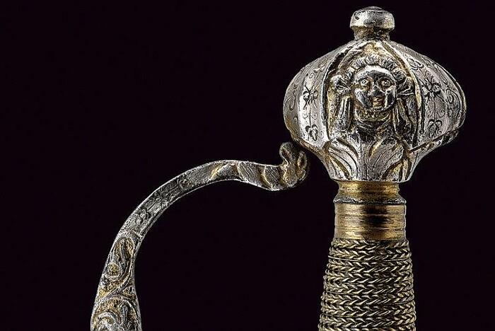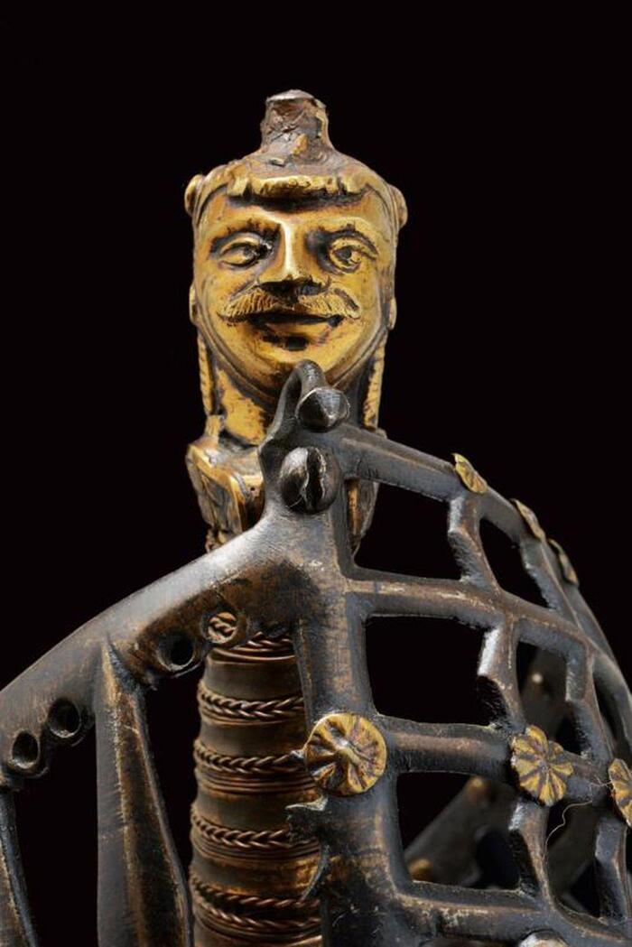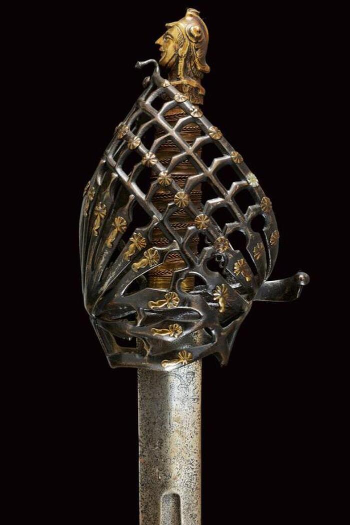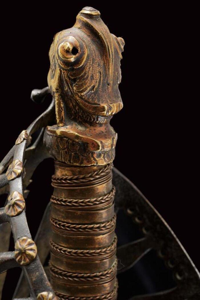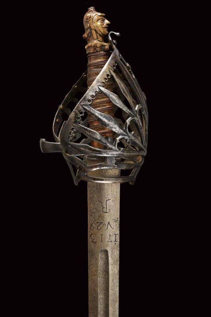 Офицерский меч типа "скьявона", 1713 год, Венецианская Республика. Железный корзинчатый эфес. Медная обмотка рукояти. Латунное навершие в форме головы воина. Общая длина 109,5 см. Продан за €14,000, 25 февраля 2022, Czerny's International Auction House.