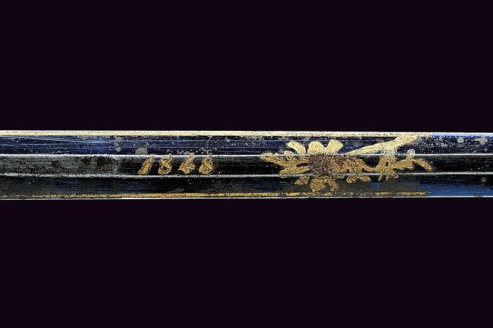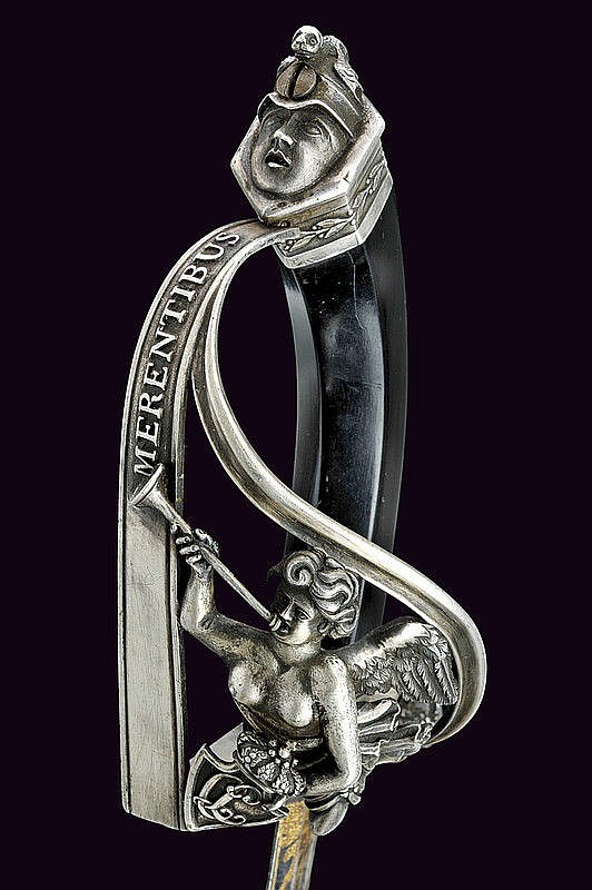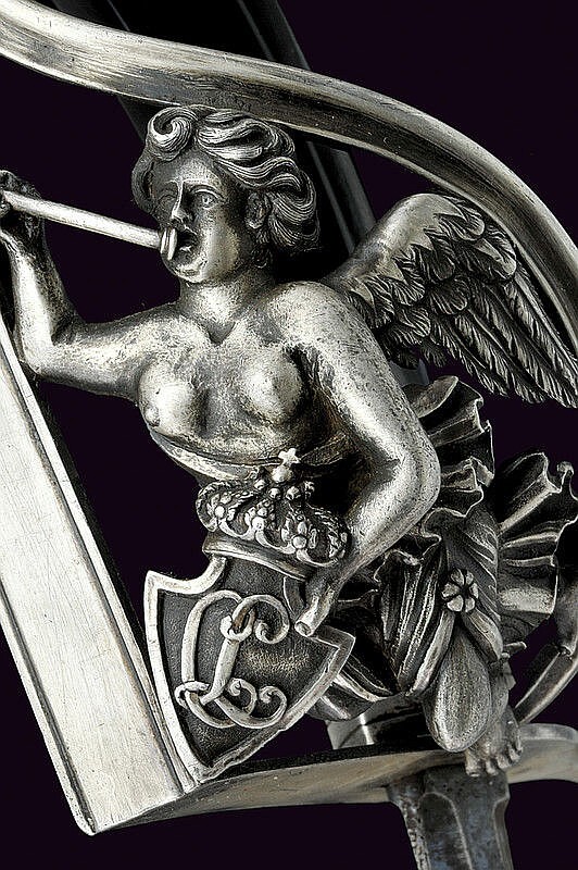 Прямой клинок шестиугольного сечения, с остатками гравированных и позолоченных украшений по вороненой поверхности, с датой "1848"; серебряный эфес, двухконтурная гарда с рельефным изображением крылатой женской фигуры, играющей на трубе и держащей в руке герцогский щит с коронованной монограммой "CL", на верхнем краю гарды надпись "MERENTIBUS" (заслуженный, лат).