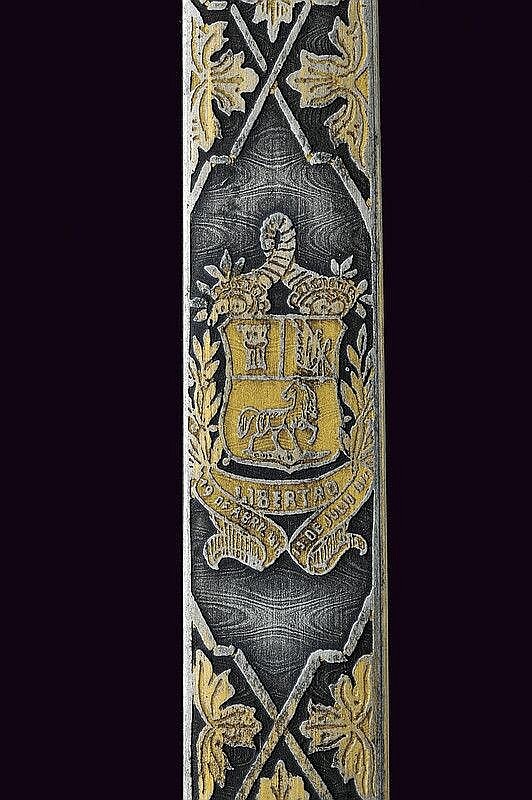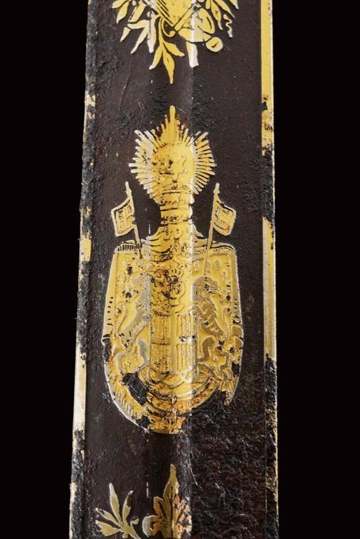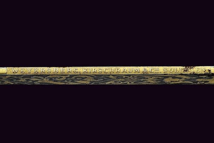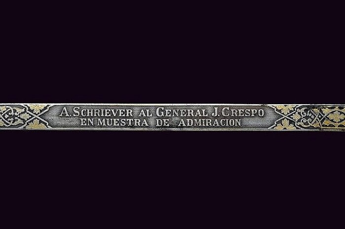 Прямой обоюдоострый клинок треугольного сечения, шестиугольный к кончик, с тонкой гравировкой и позолотой на синем фоне с посвящением "А. ШРИВЕР "ГЕНЕРАЛ Дж. КРЕСПО В РОЛИ АДМИРАЛА" с цветочными мотивами на одной стороне и герб Венесуэлы с цветочными мотивами на другой; сзади название немецкого производителя "ВЕЙЕРСБЕРГ, КИРШБАУМ и КО. "ЗОЛИНГЕН". Эфес из позолоченной бронзы с гербом Венесуэлы в центре. Кожаные ножны с позолоченными бронзовыми креплениями. Хоакин Синфориано де Хесус Креспо Торрес (22 августа 1841 - 16 апреля 1898) был политиком, военным, членом Либеральной партии Венесуэлы и президентом Венесуэлы с 1884 по 1886 и снова с 1892 по 1898 годы.
