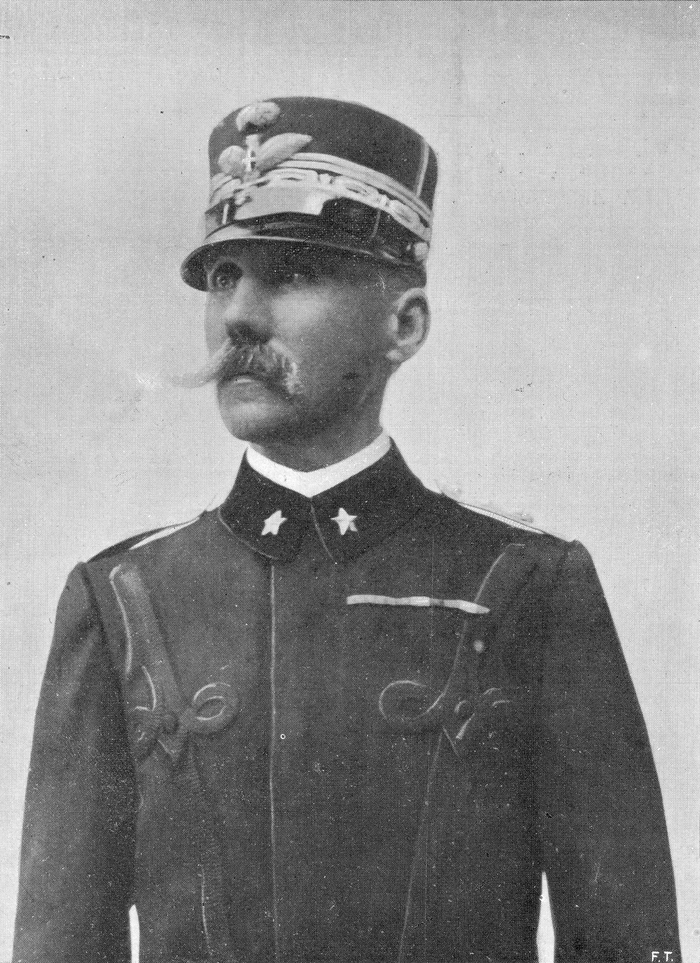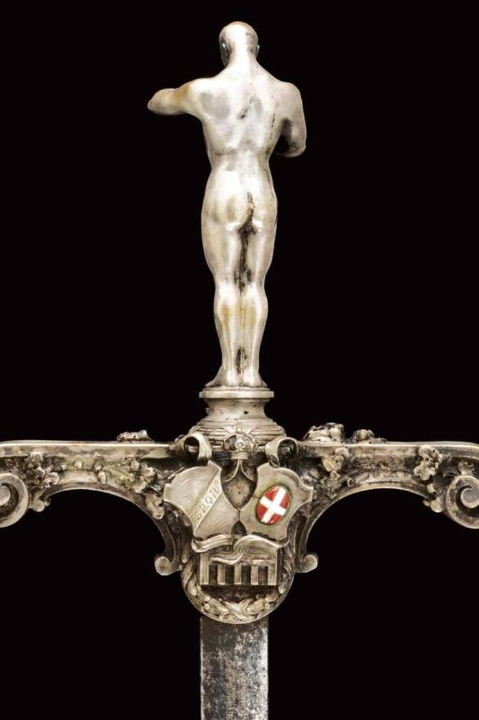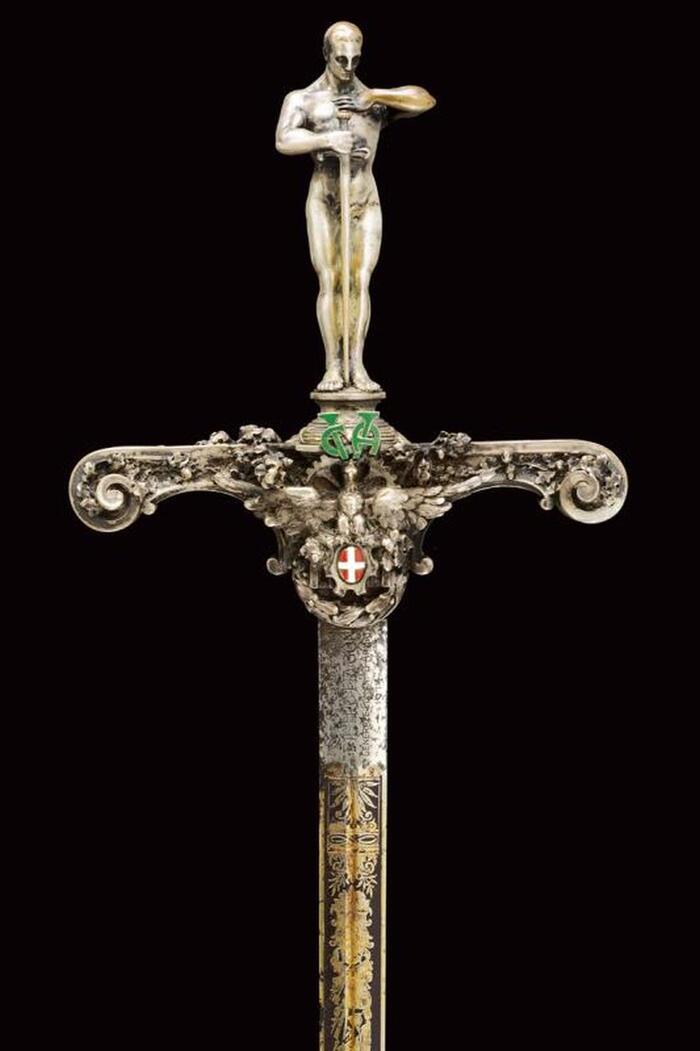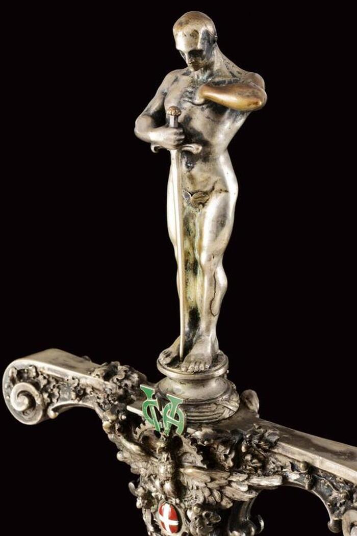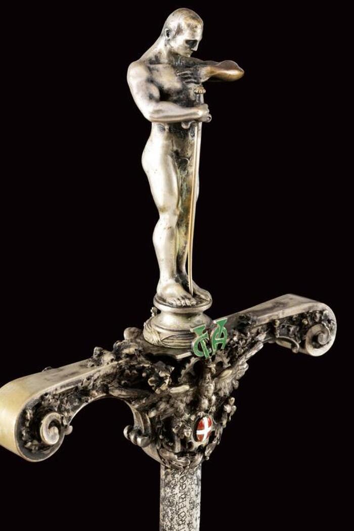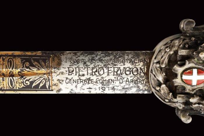 Меч с посвящением "I CORPI VOLONTARI ITALIANI PIETRO FRVGONI GENERALE COMAN".TE D'ARMATA 1914". На другой стороне надпись производителя "F. W. THEEGARTEN SOLINGEN". Серебряный эфес в центре перекладины над зубчатым колесом изображен савойский орел (красно-белый эмалированный савойский крест) и зеленая эмалированная монограмма "VCA", кильоны украшены лавровыми и дубовыми ветвями, сзади под короной два щитка, левый с надписью "S.P.Q.R", другой с эмалированным савойским крестом. Рукоятка с изображением обнаженного мужчины, держащего руку на груди, а другую опирающего на меч. Пьетро Паоло Фругони (1851-1940) был итальянским генералом, он участвовал в итало-турецкой войне и Первой мировой войне, в частности в битве при Занзуре и четырех сражениях при Изонцо. Меч - подарок генералу от итальянской "Национальной корпорации добровольцев-велосипедистов и автомобилистов".