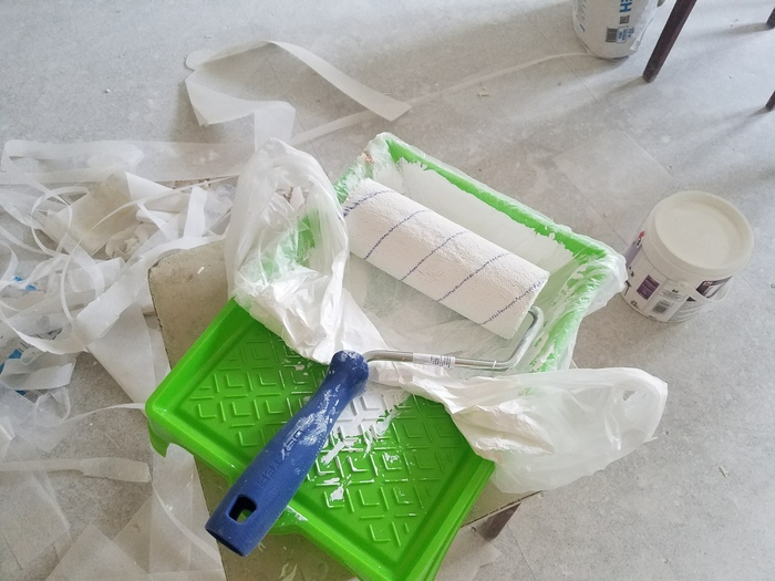 После высыхания клея занялся покраской. Купил банку матовой краски, на упаковке расчет на 20кв. Но не учел, что стеклохолст частично впитывал краску. Да и пришлось проходить в 3 слоя, чтобы добиться равномерного цвета. Итого понадобилось 3 банки. Когда покупал валик и краску кассир в леруа посоветовала использовать обычный пакет поверх емкости, чтобы хватило на несколько раз. Совет весьма дельный, пользовался им многократно)