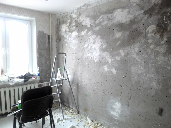 Пока шпатлевал потолок, супруга с братишкой сдирали старые обои со стен. Пульверизатором с обычной водой. Через пару минут обои легко сдираются шпателем.