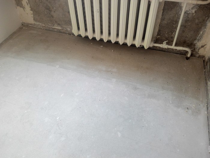 На потолок и 2 стены ушло 2 ведра ротбанда и 1 мешек фугена. Бетонные стены решили не шпатлевать, ибо не видел в этом смысла, только большие неровности и дырки. После окончания пыльных работ протер все стены и потолок тканью и прошелся грунтовкой. Также предстояло отмыть новый пол, который мы достаточно сильно засрали.