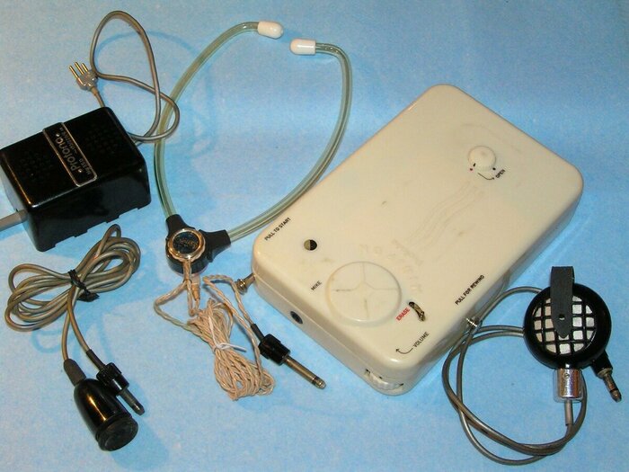 В комплект магнитофона входили микрофон и наушники. Обратите внимание как оригинально позаимствована для наушников конструкция медицинского стетоскопа.