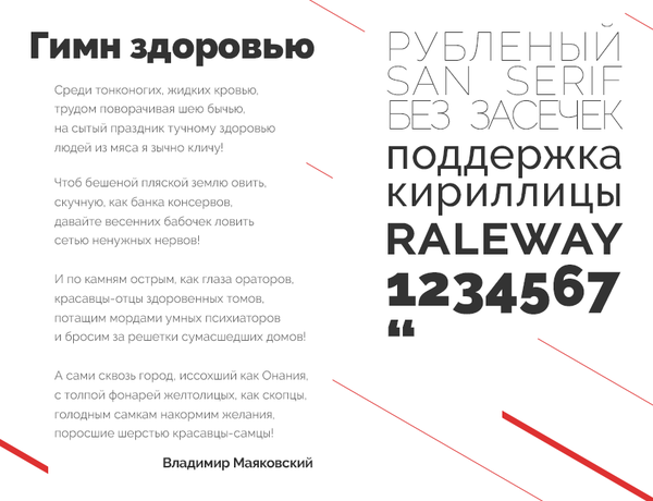 Raleway – еще один представитель акцидентных шрифтов, предназначенный для использования в заголовках. Семейство имеет поддержку европейских и кириллических языков. Всего их больше 150. Буквы имеют необычные округлые начертания. При использовании с большим кегелем выглядят броско и интересно.