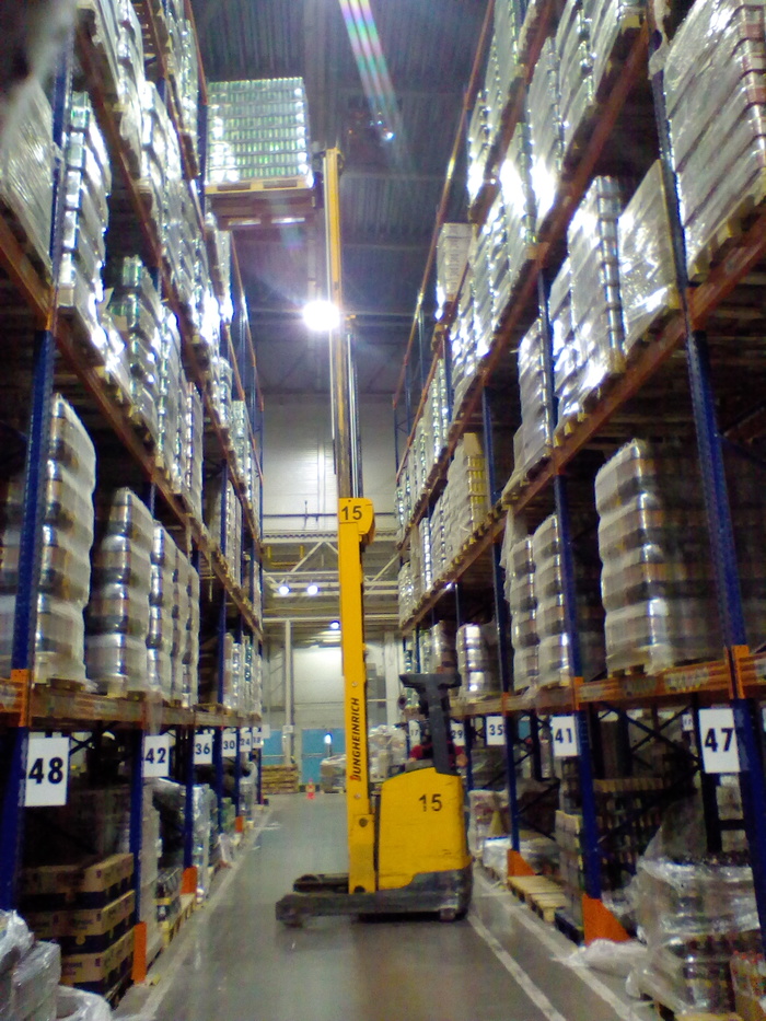 Последнее фото просто до кучи - процесс размещения алкоголя. 5 ярус, высота 8 метров, вес палеты около 700кг. Со стороны кажется, что ничего сложного - поднял и пихай. Из кабины вид совсем другой, там приловчиться нужно. Однако в кабине не до фоток))