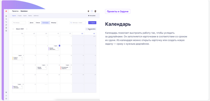 Что мне понравилось, как создателю контента, так это календарь дедлайнов задач, где я могу посмотреть контент-план на месяц. Также удобным показались шаблоны задач, хоть я и ожидал там найти какие-то готовые примеры от команды сервиса. Еще поддерживается загрузка картинок, pdf и прочих файлов общим объемом до 50 Гб на самом дорогом тарифе при его стоимости от 295 руб/месяц на члена команды.