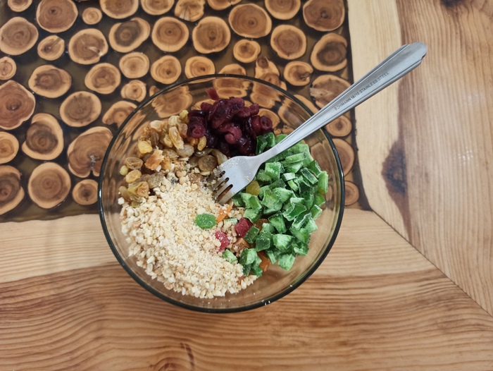 Взяла два вида изюма, тёмный и светлый, курагу, засахаренную вишню, инжир и горстку чернослива, а ещё апельсиновые цукаты и немножко клюквы, тоже засахаренной – всего с полкило или чуть больше. Порезала их на кусочки, залила хорошим коньяком и отставила в сторону.