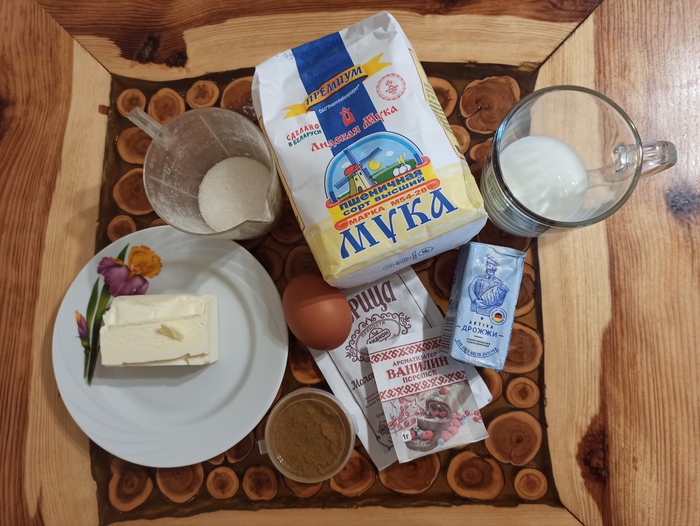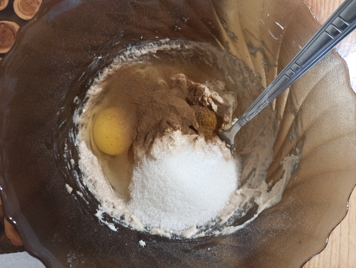 Далее добавила в тесто мягкое сливочное масло, яйцо, оставшийся сахар, соль, ванилин и специи, перемешала и стала постепенно подмешивать муку.